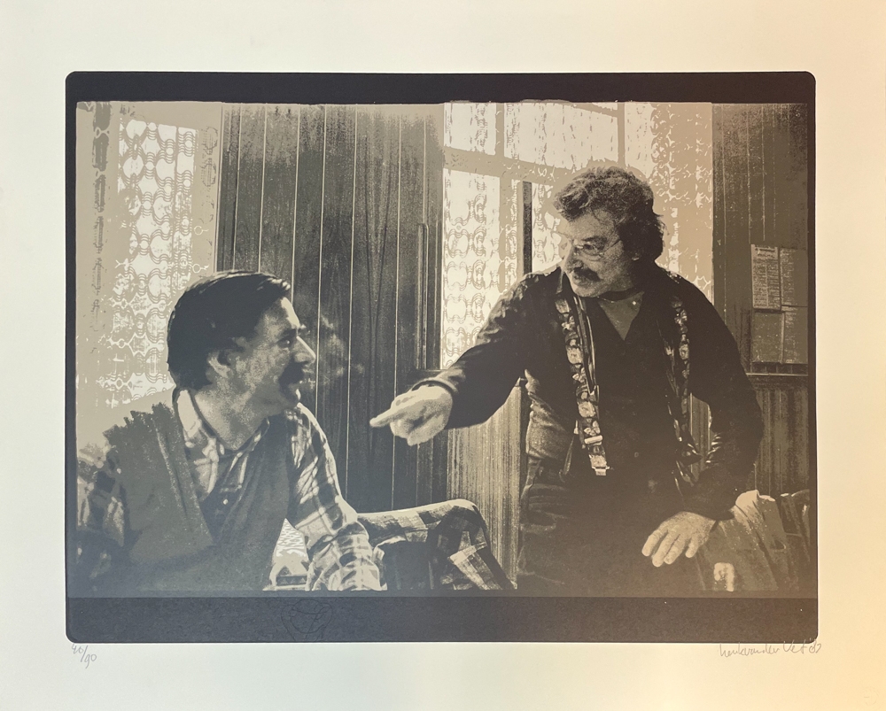 Zeefdruk van een foto waarop Christian Dotremont te zien is samen met Karel Appel. De foto's werden gemaakt tijdens het maken en drukken van de portfolio 'Duo pour Pinceau et Crayon'. Deze portfolio bevatte zeefdrukken van Karel Appel samen met Christian Dotremont.
