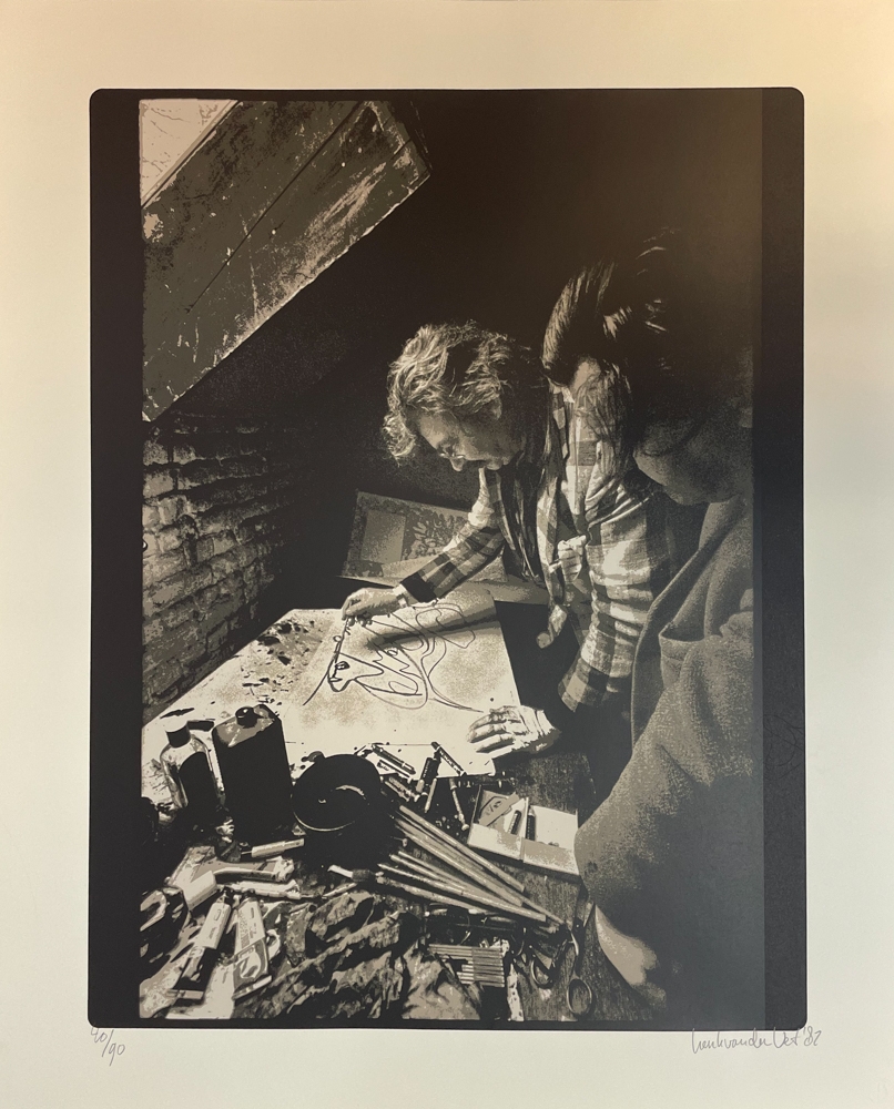 Zeefdruk van een foto waarop Christian Dotremont te zien is samen met Karel Appel. De foto's werden gemaakt tijdens het maken en drukken van de portfolio 'Duo pour Pinceau et Crayon'. Deze portfolio bevatte zeefdrukken van Karel Appel samen met Christian Dotremont.
