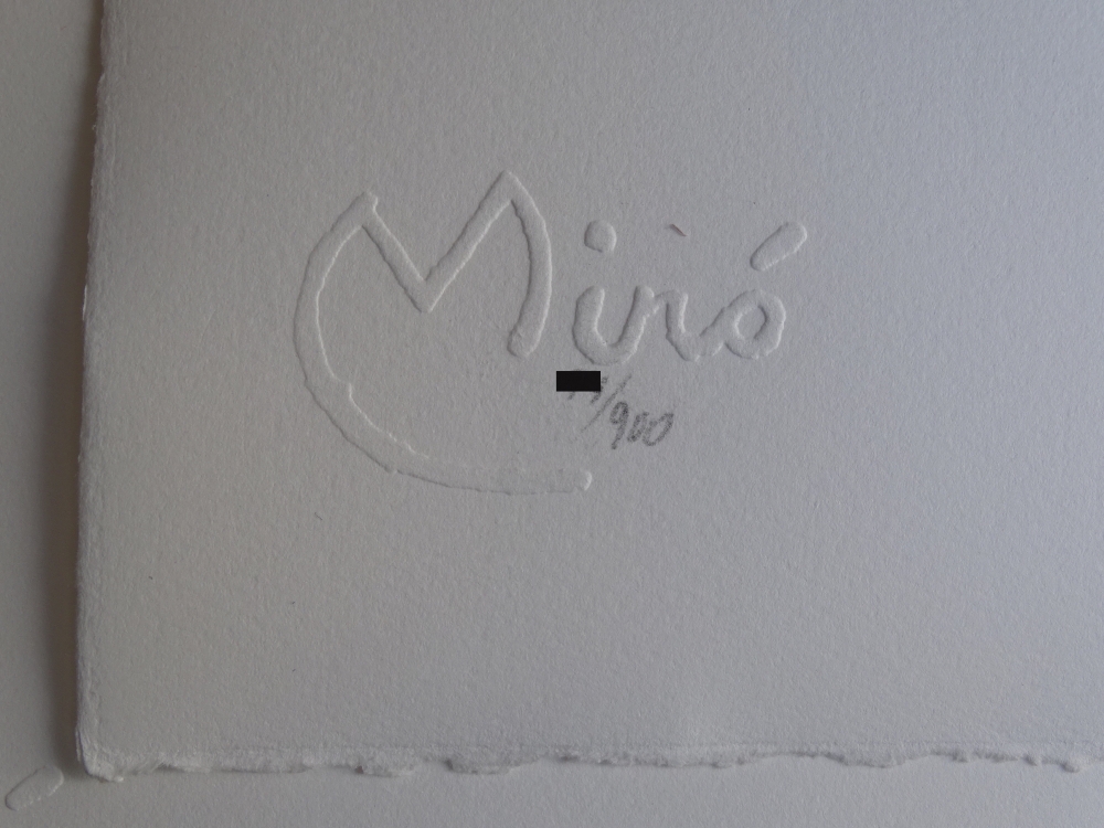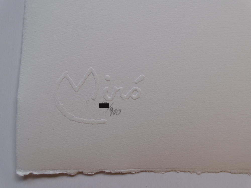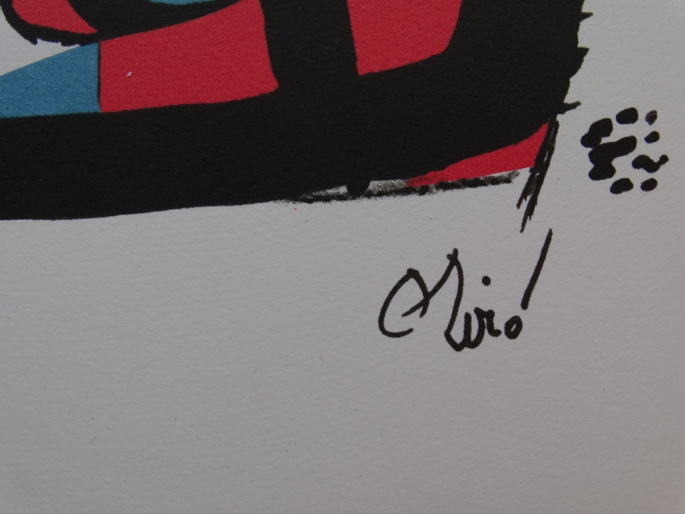 Lithograph by Joan Miró Embossed signature authorized by the artist. Justified by hand ca 39x29cm - Condition: Excellent (this work has never been framed or exhibited, and is always kept in a professional art folder, so it is kept in perfect condition). Joan Miró (1893-1983) was born in Barcelona, where he grew up and began his artistic studies. He went to La Llotja Academy against the will of his parents, who wanted him to work in a more traditional way. Later he studied at the Escola d'Art de Francesc Galí and met the Fauves and the Cubists. His emotional landscapes, those that will shape him as a person and an artist, are essentially Mont-roig, Paris, Mallorca and later New York and Japan. Mont-roig, a small town in the Baix Camp region, will be the counterpoint to the intellectual upheaval that lives in Paris, where he moved in the 1920s with the surrealist poets and the most creative artists of his time. There he got to know Arp, Magritte, Brancusi and Giacometti and exhibited together with Dalí, Tanguy, Meret Oppenheim and Max Ernst in various exhibitions on Dadaism and Surrealism. The stimulus of abstract expressionism was discovered in New York in the 1940s. Later, in 1956, in the midst of World War II, Joan Miró left his exile in France and settled in Palma de Mallorca, a refuge and work space, where his friend Josep Lluís Sert designed the workshop he had always dreamed of. There he focused on sculpture and ceramic work, until his death in 1983. His roots in the landscape of Mont-roig first and that of Mallorca later will be decisive in his work. The link with the land and interest in everyday objects and the natural environment will be the background of some of his technical and formal investigations. Miró flees from academicism, in the constant search for a global and pure work, not attached to any specific movement.