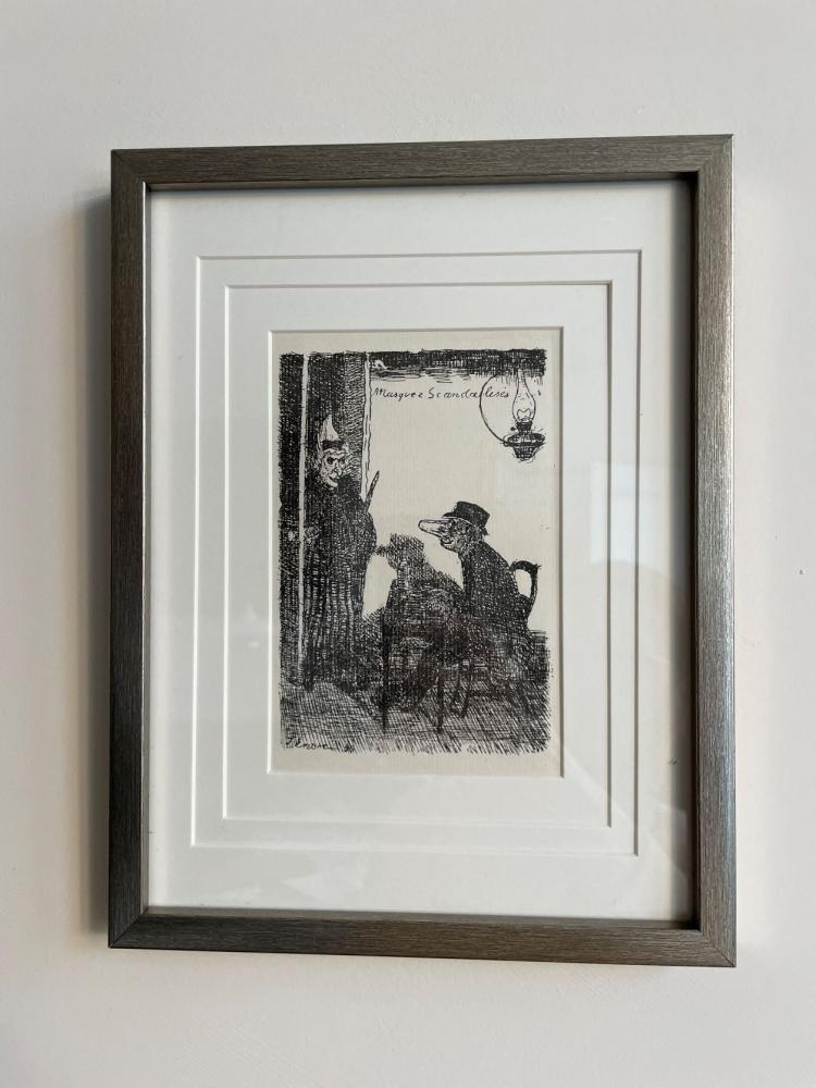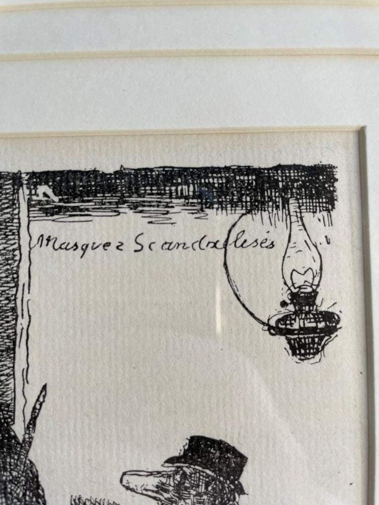 Beautiful print by James Ensor (1860-1949) titled 'Masques Scandalisés' from 1895. James Ensor was one of the greatest Belgian artists of the 20th century. Offset print, signed in the plate 'Ensor 95', label at the back states edition 65/500. This print is printed on Dutch paper Van Gelder 'double beehive laid'. In frame with 3x passe partout. Masks are a typical feature in the artist's oeuvre, based on the masks his mother sold in her shop and at the carnival in Ostend. print dimensions: 9.5 cm x 13 cm frame dimensions: 26cm x 20cm Shipping is done in bubble pack and cardboard and is insured, pick up is also possible.