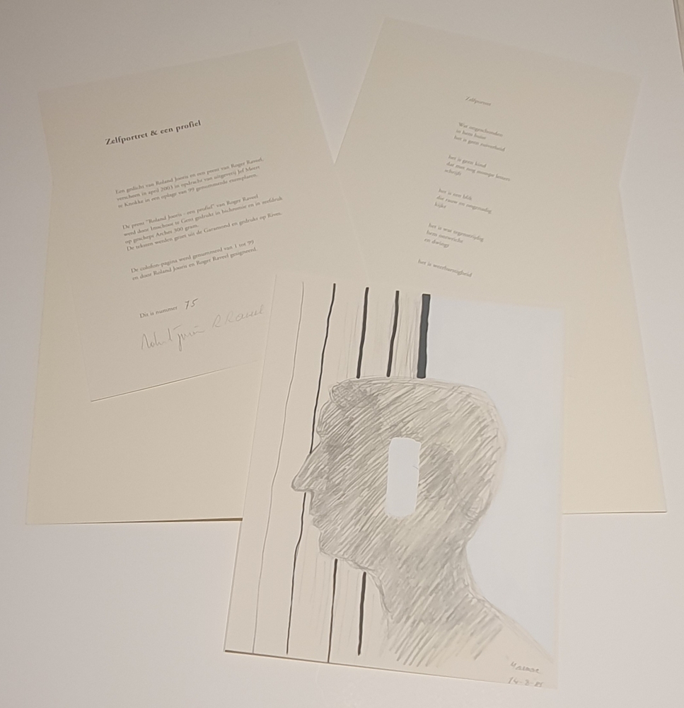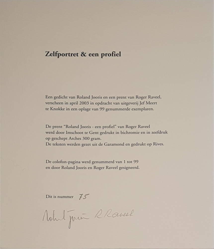 Bibliophile edition (folder) consisting of a poem by Roland Jooris and a serigraph by Roger Raveel. The folder is complete. The colophone was signed by both Roland Jooris and Roger Raveel. This work is in good condition and is numbered 60/99.