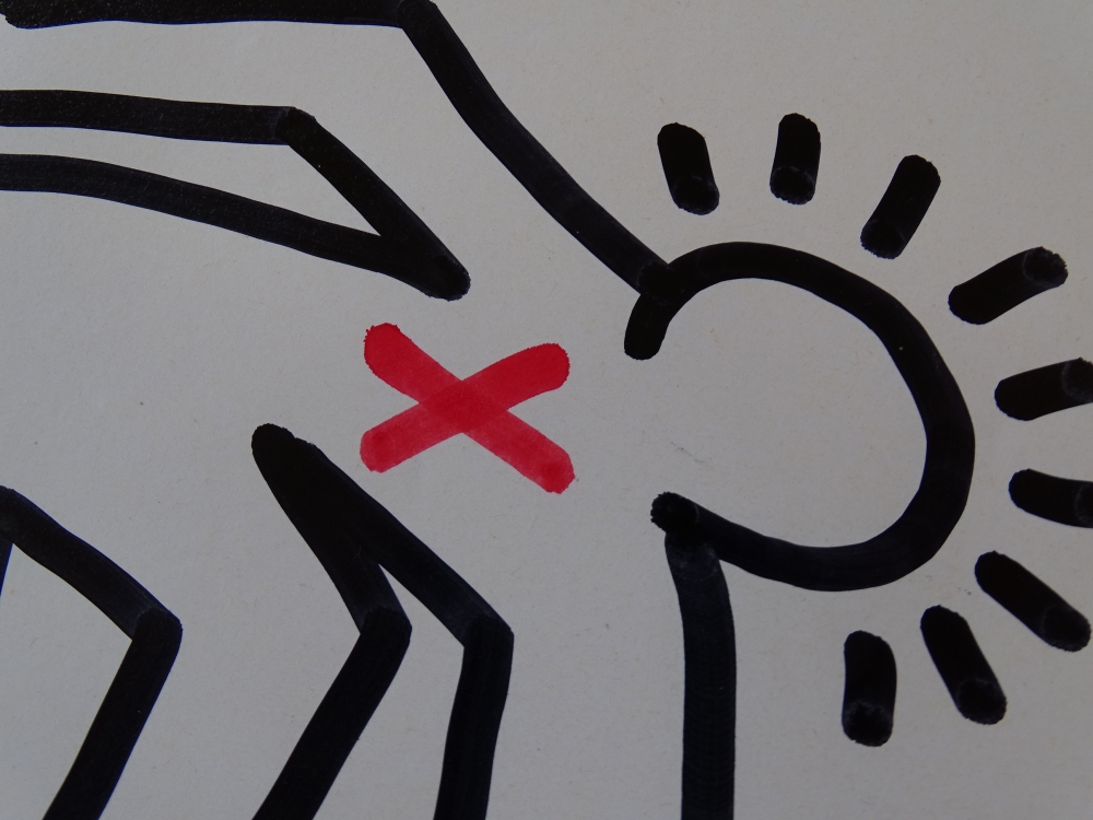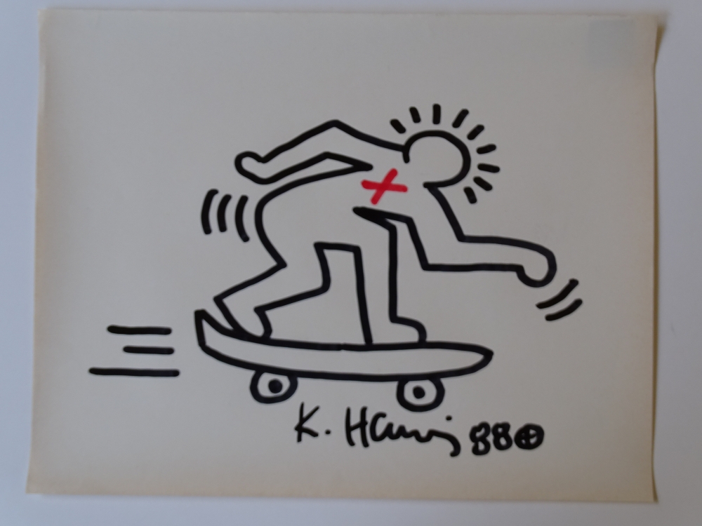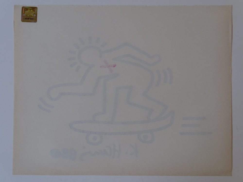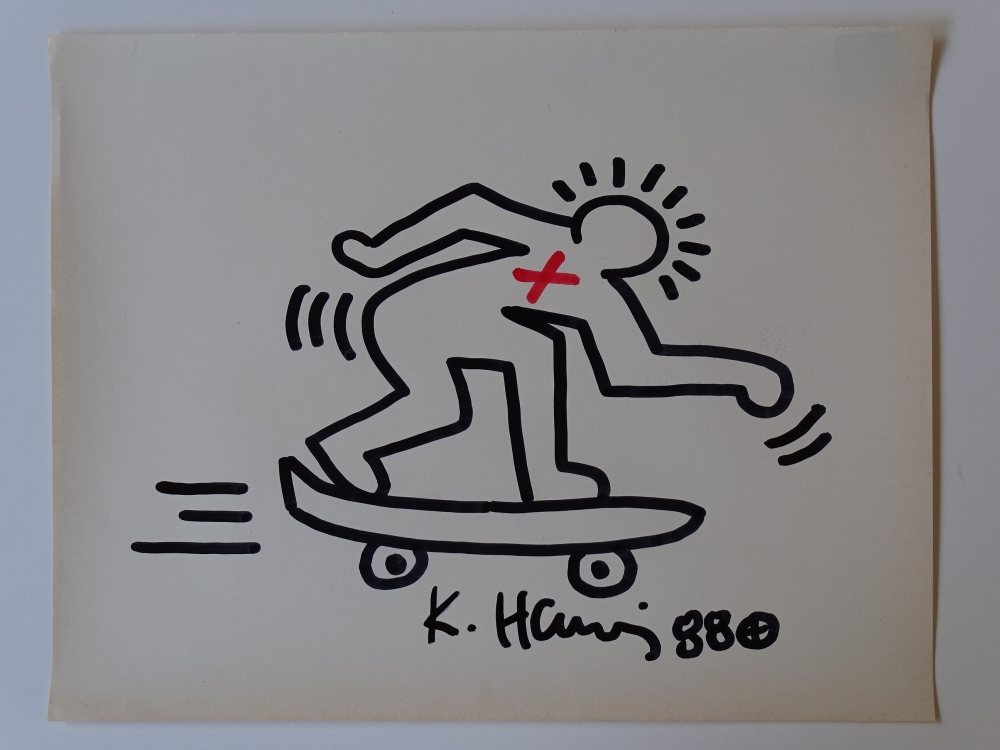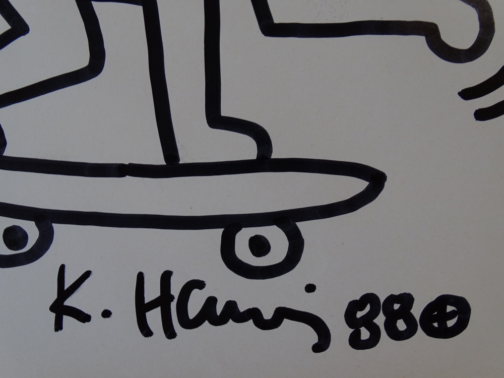 Keith Haring (attributed), ink drawing, signed, dated with certificate Keith Allen Haring (May 4, 1958 February 16, 1990) was an American artist whose pop art emerged from the New York City graffiti subculture of the 1980s. His animated imagery has "become a widely recognized visual language". Much of his work includes sexual allusions that turned into social activism by using the images to advocate for safe sex and AIDS awareness. In addition to solo gallery exhibitions, he participated in renowned national and international group shows such as documenta in Kassel, the Whitney Biennial in New York, the São Paulo Biennial, and the Venice Biennale. The Whitney Museum held a retrospective of his art in 1997.