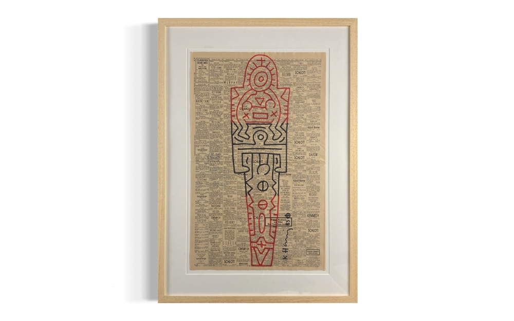 Original drawing on newsprint by American artist Keith Haring. The work has been dated and signed and bears a stamp on the back. Professionally supervised; 52.5x72x5cm. Insured shipping or collection possible.