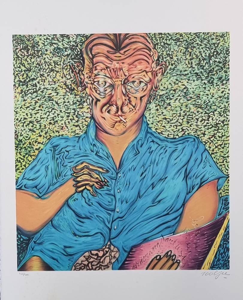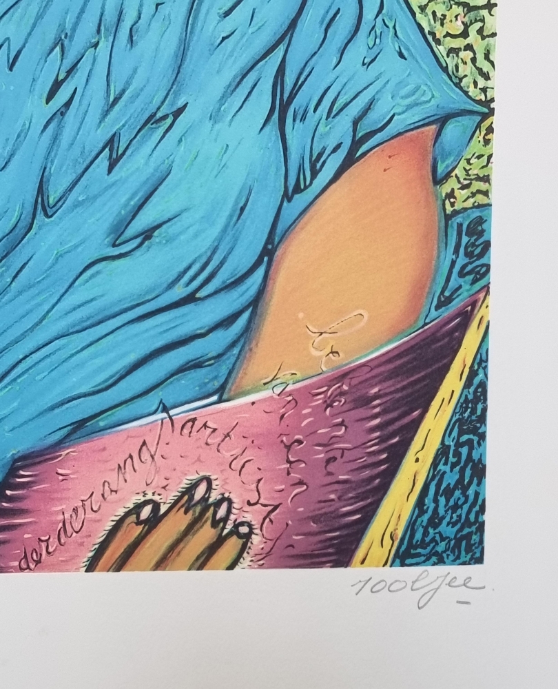 Kleurenlitho Gesigneerd en genummerd in potlood Perfecte staat NNiet ingelijst Pjeroo Roobjee (° Gent 7 febr. 1945) volgde lessen schilderkunst, tekenkunst en graveren aan de Koninklijke Academie voor Schone Kunsten van zijn geboortestad en aan de voorbereidende afdeling van de Rijksacademie te Amsterdam. Heden is hij werkzaam als schilder, tekenaar, graficus, acteur, causeur, auteur, theatermaker, entertainer en zanger. Hij publiceerde een aantal leesboeken, een rond getal toneelwerken en drie dichtbundels. Zijn overwegend monumentale doeken bereisden de vijf werelddelen en vertegenwoordigden de natie op belangrijke kunstmanifestaties zoals de Biënnales van Sâo Paulo en Venetië. Zijn plastische zowel als zijn literaire bezigheden werden meermaals bekroond. Zo werd hij menig keer onderscheiden in de Prix de la Jeune Peinture, werd hij laureaat van de Leo J. Krijnprijs voor zijn debuutroman De Nachtschrijver en ontving hij in 1984 de Eugène Baie-prijs. In 1994 werd hem de Louis Paul Boon-prijs toegekend, in 1998 werd hij bekroond met de Arkprijs van het Vrije Woord en in 2004 werd hij laureaat van de Cultuurprijs van de stad Gent voor zijn literair werk.
