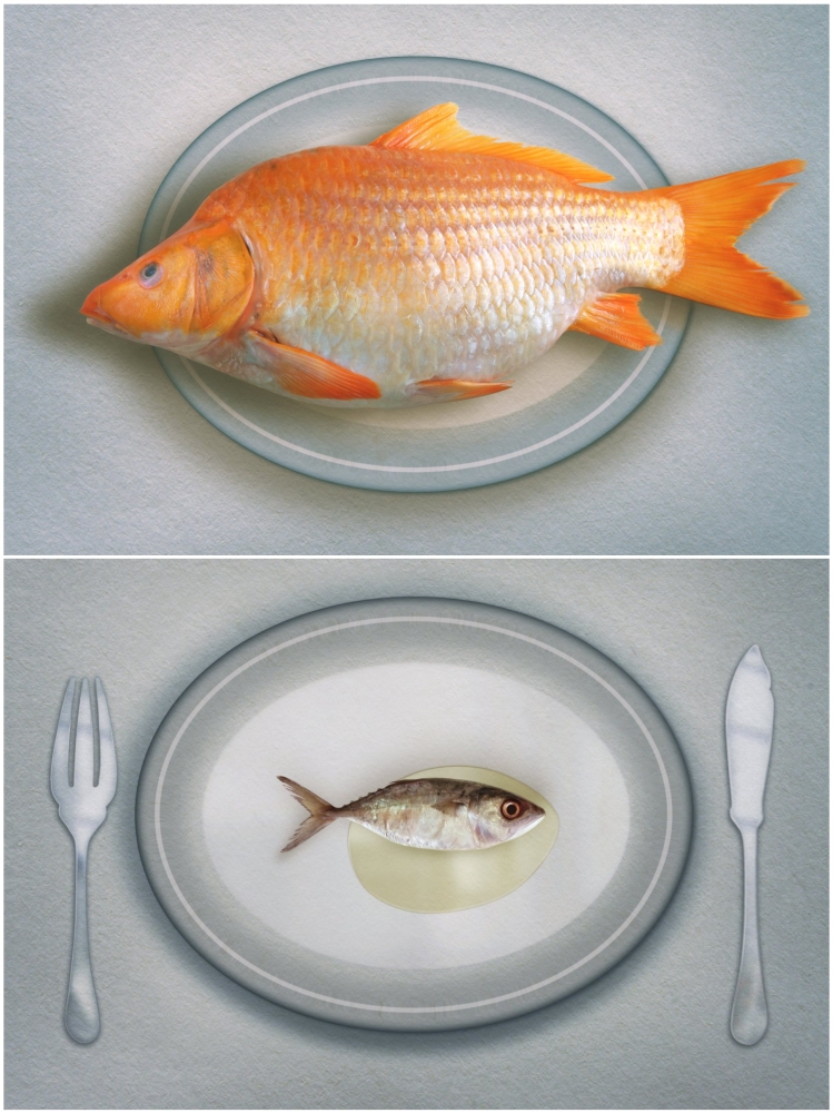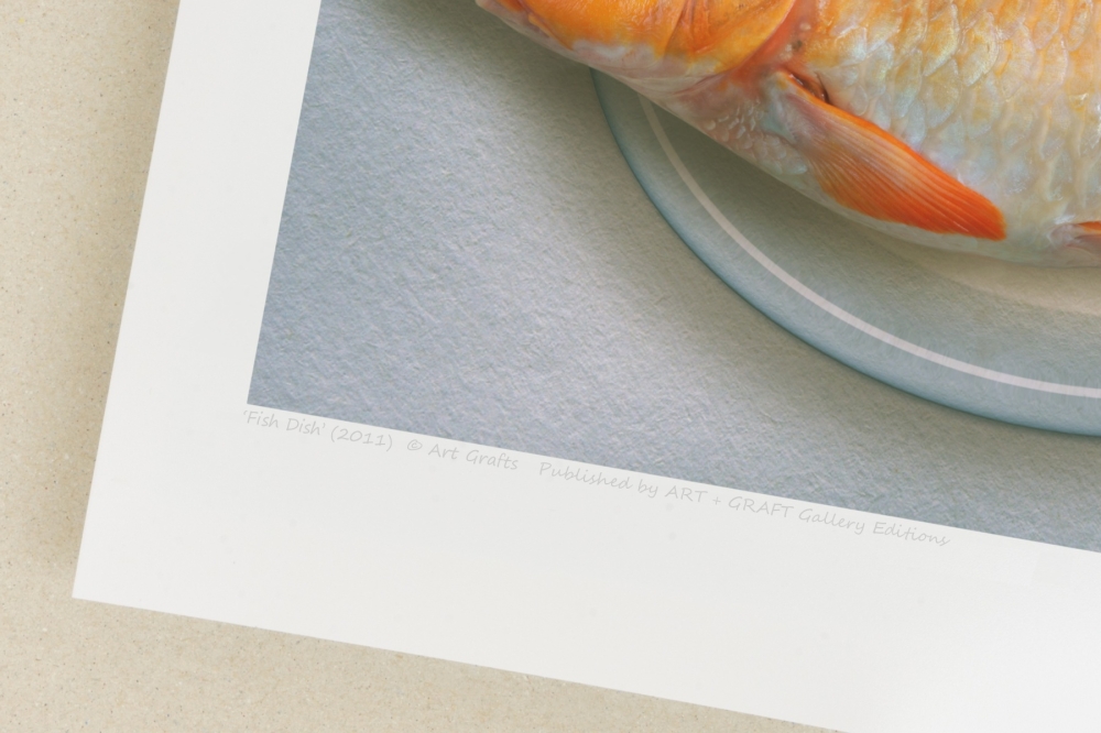● Two 15" x 12" Chromogenic Prints ● Fish Dish (2011) ● Fish Oil (2011) Image sizes 13" x 9½" (33 x 24 cm) - Print sizes 15" x 12" (38 x 30 cm) ● Hand-signed with numbered gallery stamps on rear ● Titles below images ● Signed Artist Certificate of Print Authenticity ● Mint condition ● Ships rolled in a large PVC tube