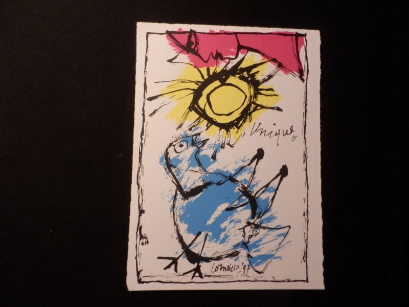 Zeer fraai kleurenlitho van de bekende COBRA kunstenaar Corneille uit 1997. Afmeting van het litho 15 x 21 cm in nieuwstaat ( het werk is nooit ingelijst geweest ) Het litho is in de druk gesigneerd.