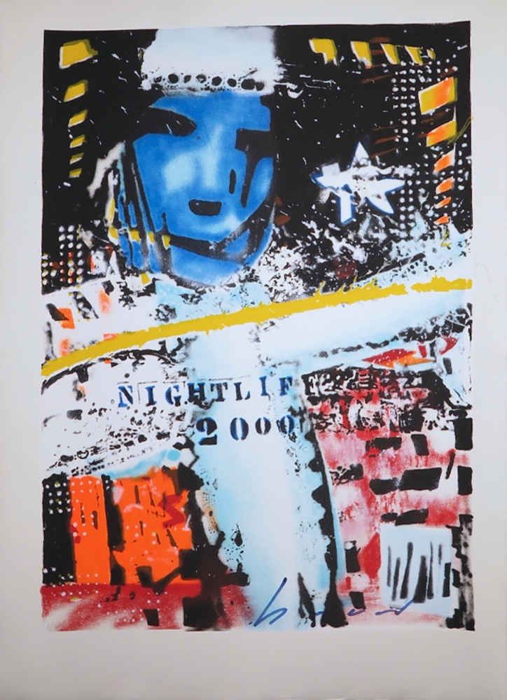 Zeer mooie en grote zeefdruk van Herman Brood Nightlife 2000. Dit werk is gemaakt op 125 exemplaren waarvan dit nr 8 is. Hij is handgesigneerd door de kunstenaar onderaan. De afmetingen zijn 107 x 65 cm.