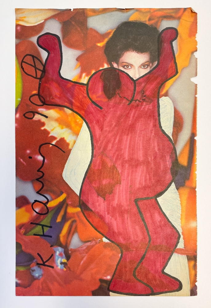Originele tekening opgedragen aan Keith Haring. Gemaakt op de pagina van een tijdschrift. Het werk is gesigneerd K. Haring. Het werk toont ouderdomssporen gezien de leeftijd van het werk.