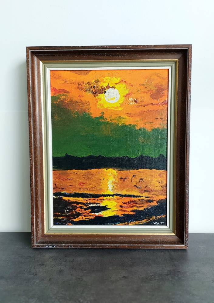 "Als voorzitter van de kunstraad kan ik niet ontbreken, ik werk maar al te graag mee aan de eigen projecten en vooral deze voor het goede doel. "Willy Van Ransbeeck schenkt hierbij zijn kleurrijk kunstwerk 'zonsondergang', dit werk heeft hij gemaakt in 1977 maar is nog steeds actueel.