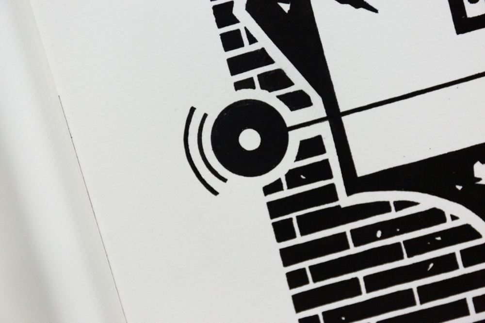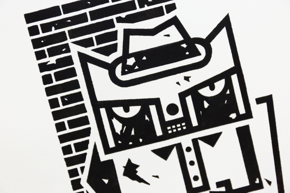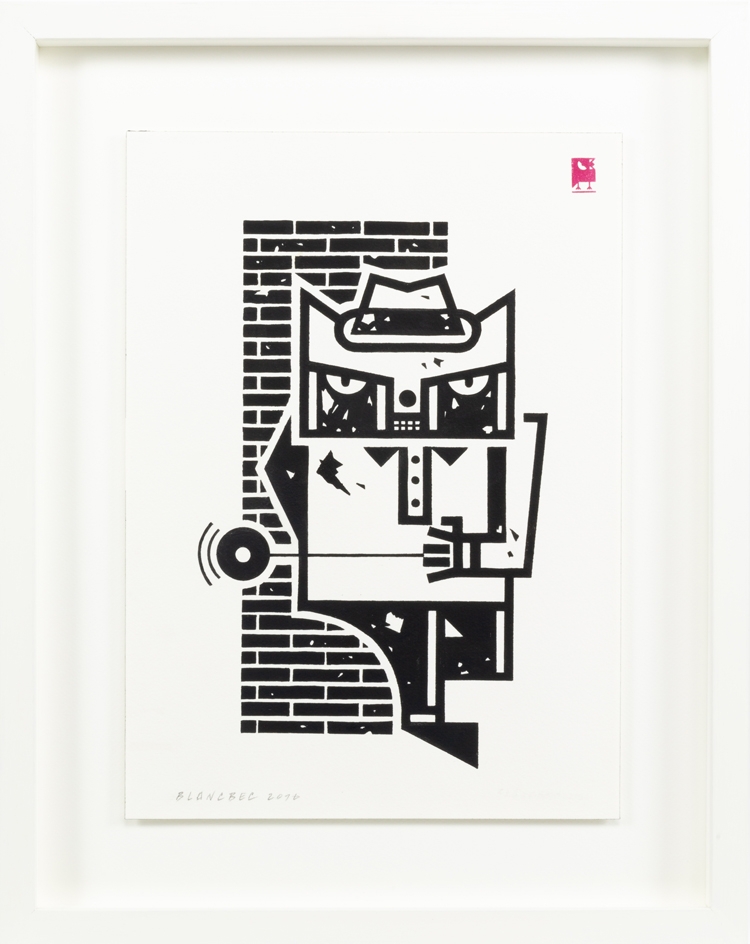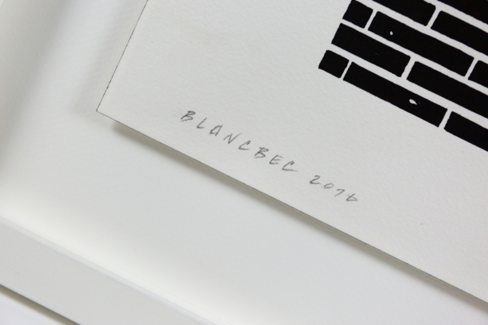 Uniek schilderij van Brusselse street art kunstenaar Blancbec. Erg mooi zwevend ingelijst met ontspiegeld museumglas. Dit werk kadert binnen zijn expositie "Trafik" uit 2016 en is vrij kenmerkend voor de stijl van Blancbec. Waar blancbec toch vaak met kleuren werkt koos hij hier voor een doordringend contrast van het zwarte beeld op een helderwitte achtergrond.
