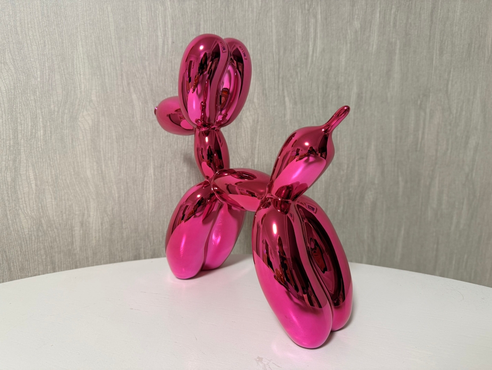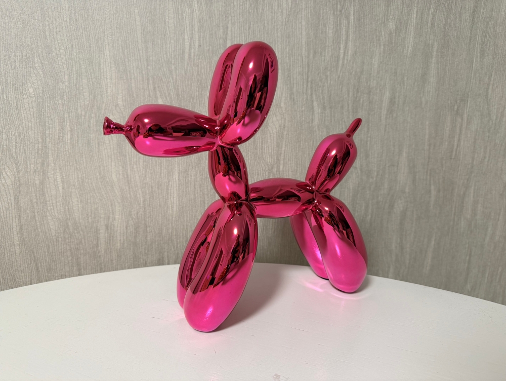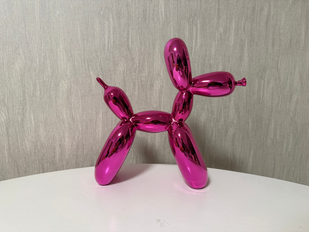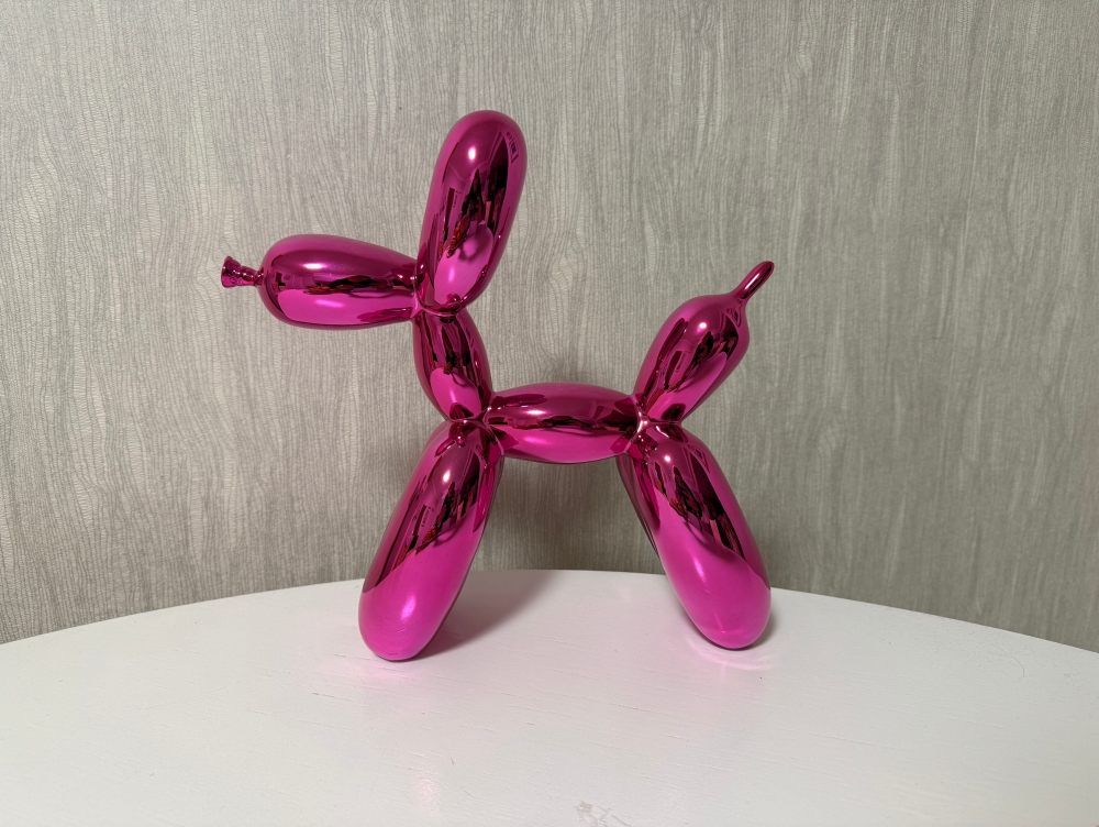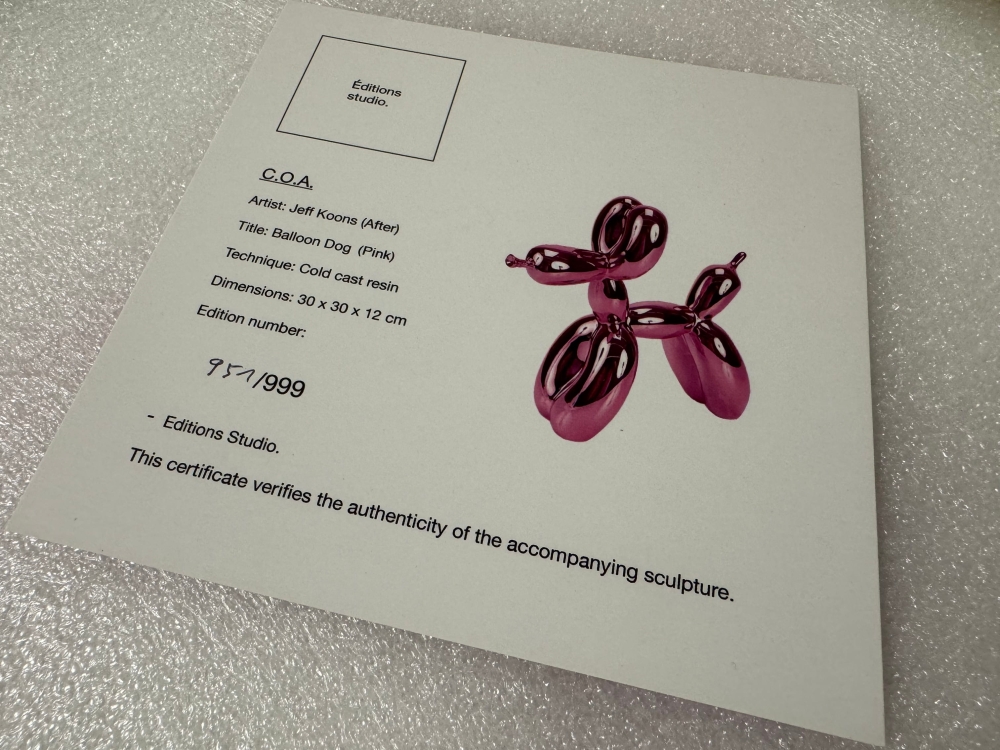 Balloon Dog in 'PINK'. Collector's item. Rare color! Original packaging and certificate available. Numbering at the bottom of the legs. This is the first rare edition limited to 999 pieces worldwide. This is No. 951. Careful, fast and insured shipping. More info: Jeffrey Jeff Koons (born January 21, 1955) is an American artist whose work is dominated by the themes of banality and seduction. He lives and works in both New York City and his hometown of York, Pennsylvania. Jeff Koons is without a doubt one of the most important living artists and his work is included in the most prominent contemporary (museum) collections in the world. Koons's merit lies in the incorporation of kitschy elements in 'Art with the capital A', which is why his work is called postmodernist, in the same breath as that of Andy Warhol. Koon's work has similarities to Pop Art, in that he takes elements from lower art and incorporates them into higher art. His work is considered to belong to the Neo Pop Art category, where in the case of Koons one speaks of überkitsch: kitsch that is so strongly encouraged that it can no longer be enjoyed and that is precisely the reason for its artistry. Koons's works sell for astronomical sums, for example, in 2013 during a contemporary art auction at Christie's in New York, Koons's Balloon Dog Orange was sold for more than 58 million dollars, the most expensive work ever for a living artist. Jeff Koons has made a number of limited reproductions of the Balloon Dog, which are available at Kunsthuizen.