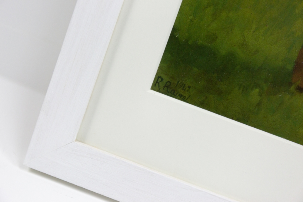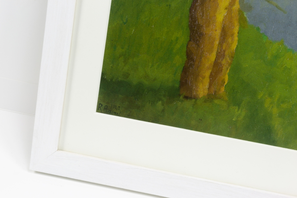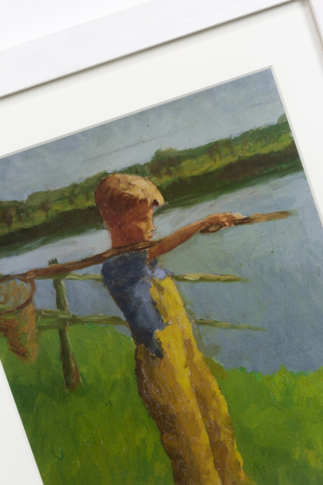 Werk is mooi ingekaderd in ontspiegeld glas en klaar om op te hangen.