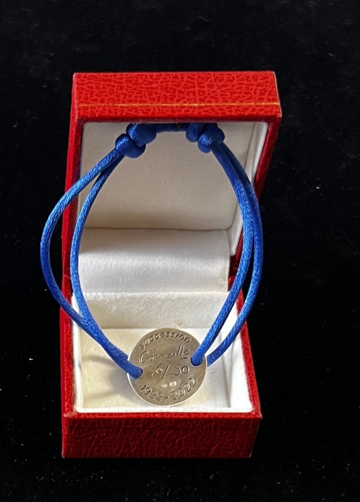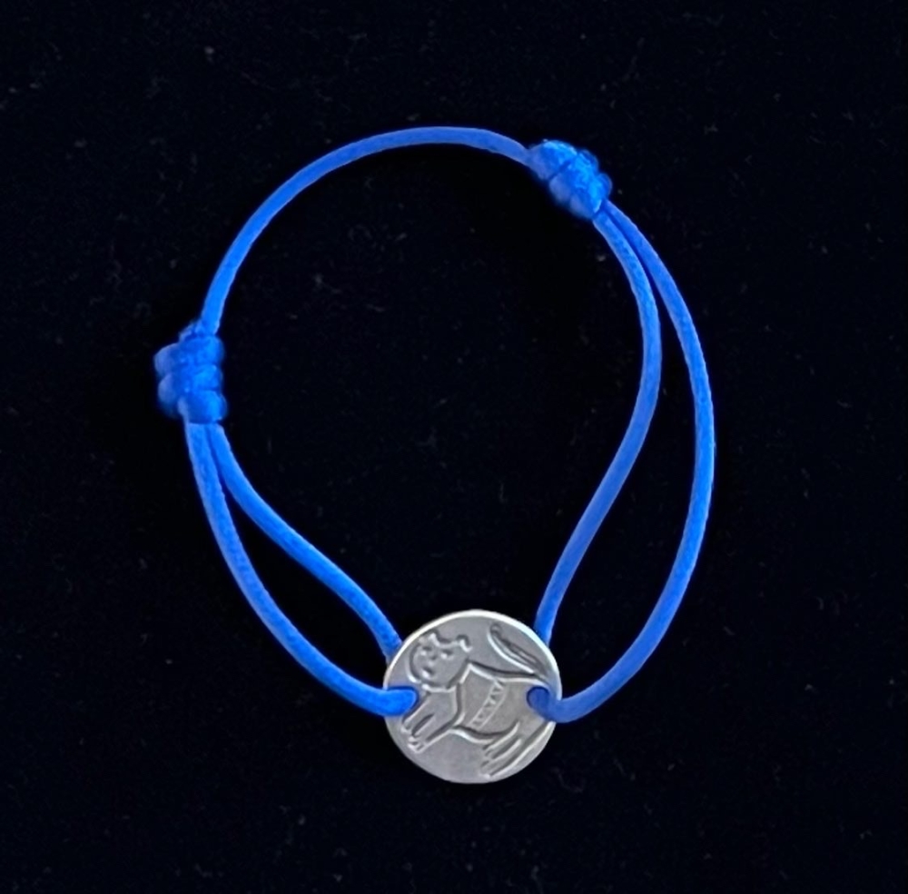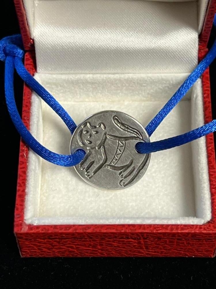 Cat bracelet - (for men and women) Succession Guillaume Corneille - Numbered edition of 50 - Silver heart 3.5 grams. 2 cm diameter, blue silk link, adjustable. Suitable for all wrists. Brand of jeweller Philip Cardon. Based on a piece of jewellery by Corneille dating from the 1990s. n°46 - Perfect for a gift!