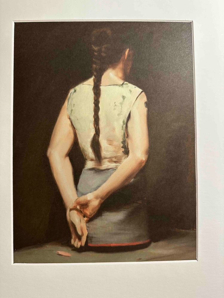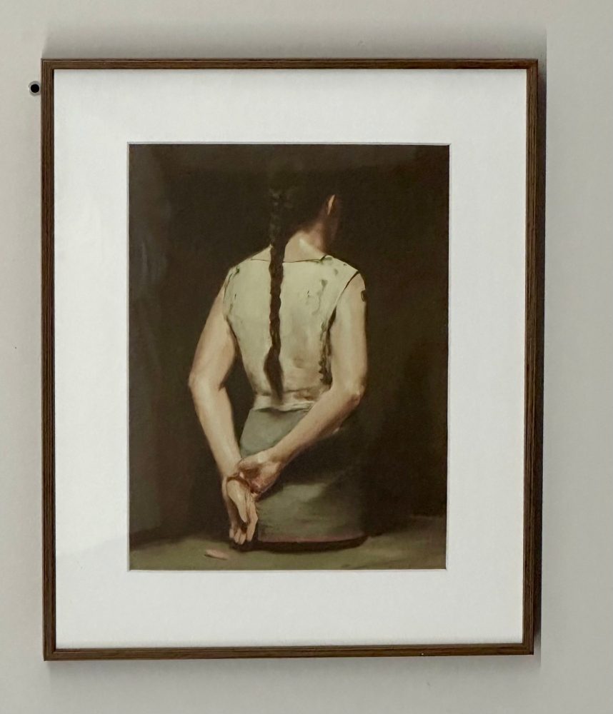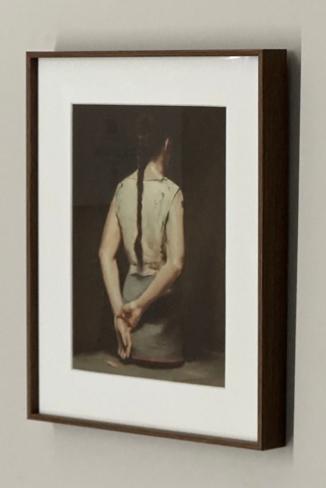 Mooie offsetlitho van Michaël Borremans. Titel: Automat (I) Oplage: beperkte oplage Ingelijst in een professionele Nielsen lijst. (donker eik/aluminium) Met bijpassende witte, zuurvrije passe partout. Dit werk werd op de achterkant in potlood met de handgesigneerd door Michaël Borremans. Een terugkerend thema in Borremans' werk is de figuur van een jong meisje in trui en rok. Het zou een schoolmeisje van lang geleden kunnen zijn. De figuur verschijnt voor het eerst in een tekening van 2002, waarin ze is afgebeeld op een zwarte sokkel. In 2005 maakte Borremans een video waarin het meisje tot leven komt en eindeloos om haar as draait. In 2008 volgde nog een reeks olieverfschilderijen, waaronder Automat (I). In dit werk is de figuur op de rug afgebeeld, met gekruiste handen en een lange vlecht.