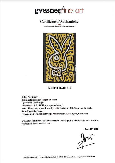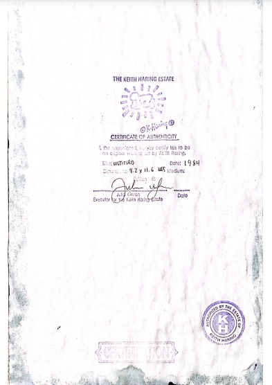 Artwork (after) Keith Haring. Drawn in felt pen on paper. Signed and dated 1984. Stamp on the back. Dimensions: 8,2 x 11,6 inches (approximately). With certificate of gvesner fine art, signed 25/06/2012 by Julia Gruen.