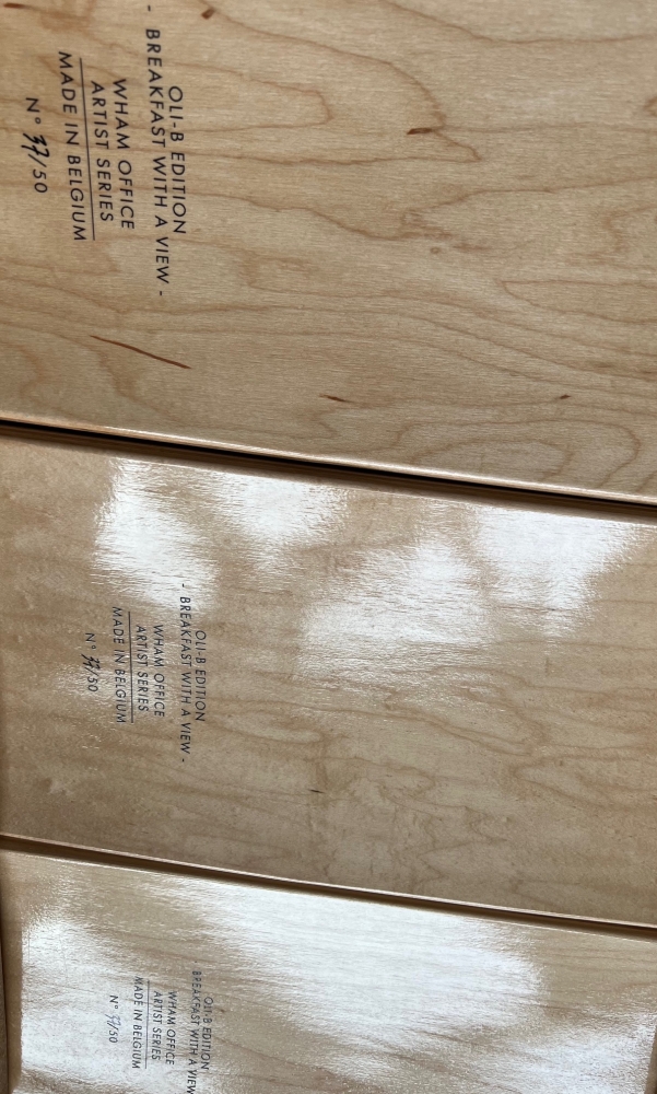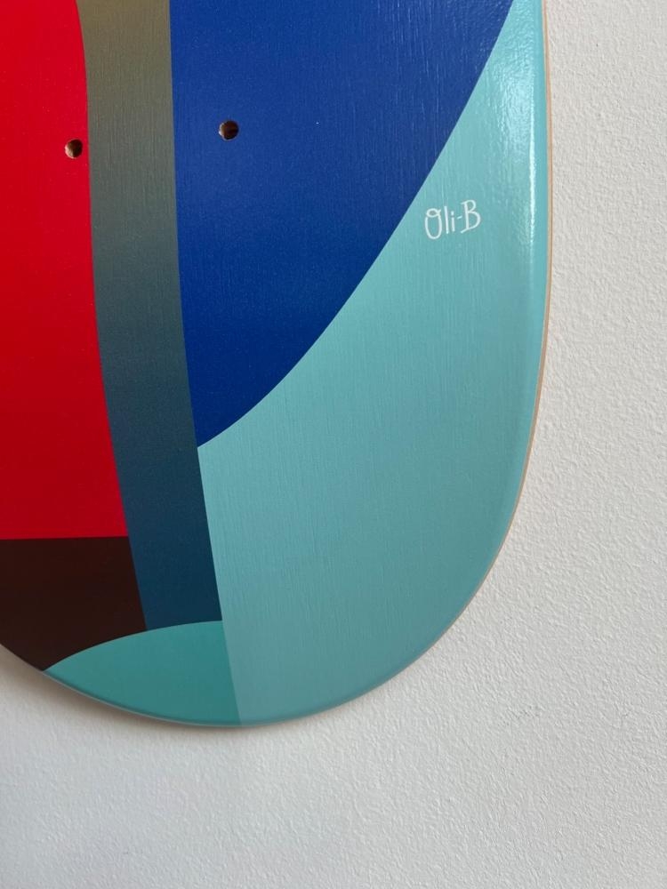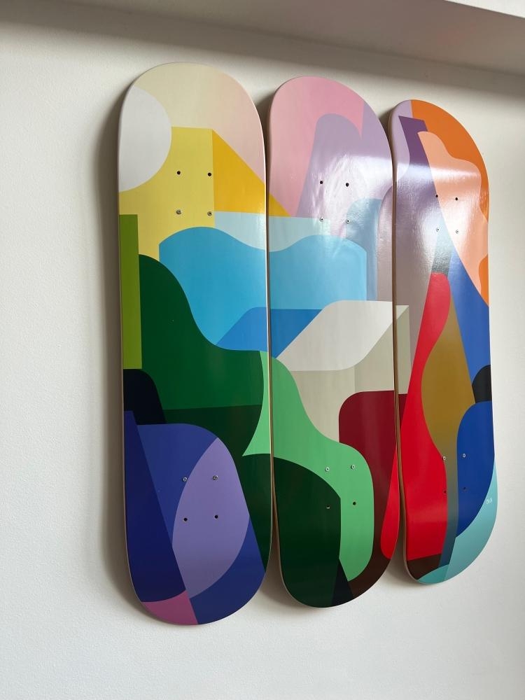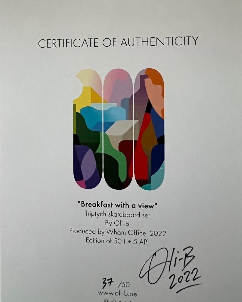 Breakfast with a view. Skateboard triptych by Oli-B handgesigneerde en genummerd certificaat aanwezig. Perfecte staat, ophangsysteem inbegrepen. Die stuks naast elkaar meet 62 x 83 cm Triptych skateboard set Comes with signed and numbered COA by the artist. EasyFix wall mounts included.