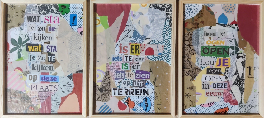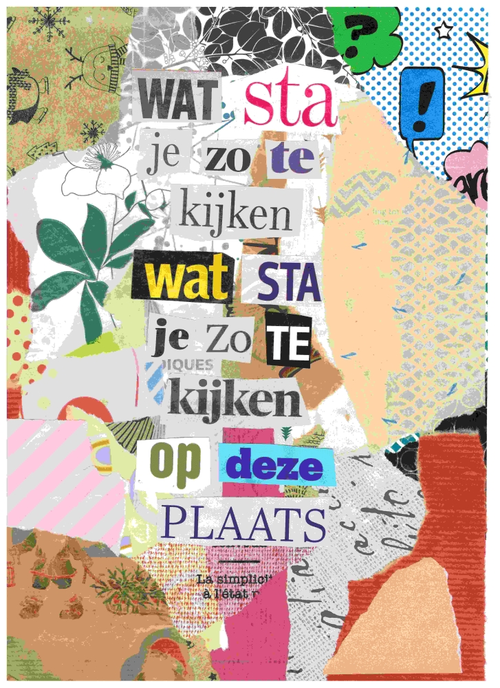 Collage papier - 3 stuks van A4-formaat - Wat sta je zo te kijken - Wat sta je zo te kijken op deze plaats - Is er iets te zien - Is er iets te zien op dit terrein - Hou je ogen open - Hou je ogen open in deze eeuw - Geert onderzoekt de visuele aspecten van de moedertaal. Hij is een geletterd mens, een gewaardeerd popkenner, een amateurknutselaar, een waarachtige leugenaar, Minister van Staat en de vader des vaderlands. Hij is stichtend lid van Collectief Tactique Triste. Wat u ook moge lezen, Geert is geen sportvisser, geen unionist en zeker niet de man van uw dromen.