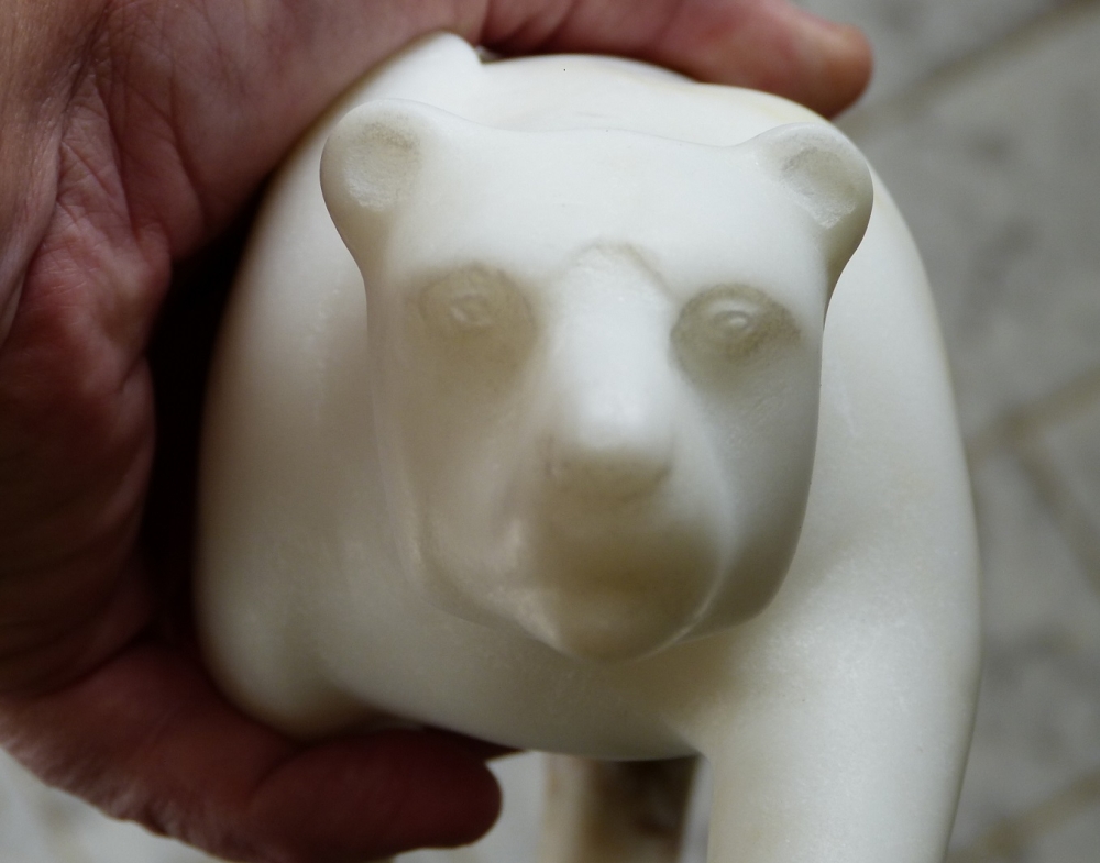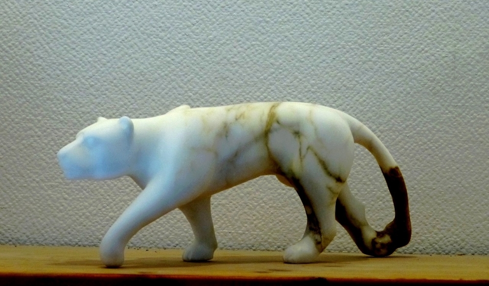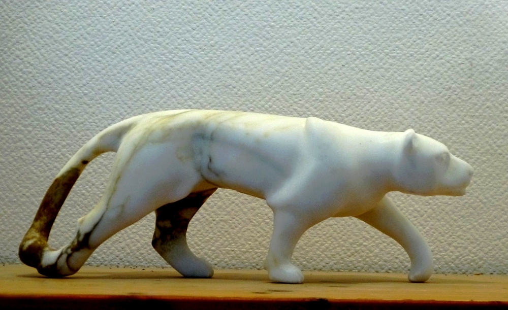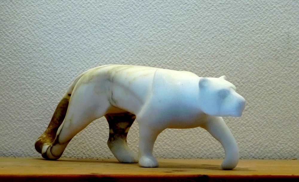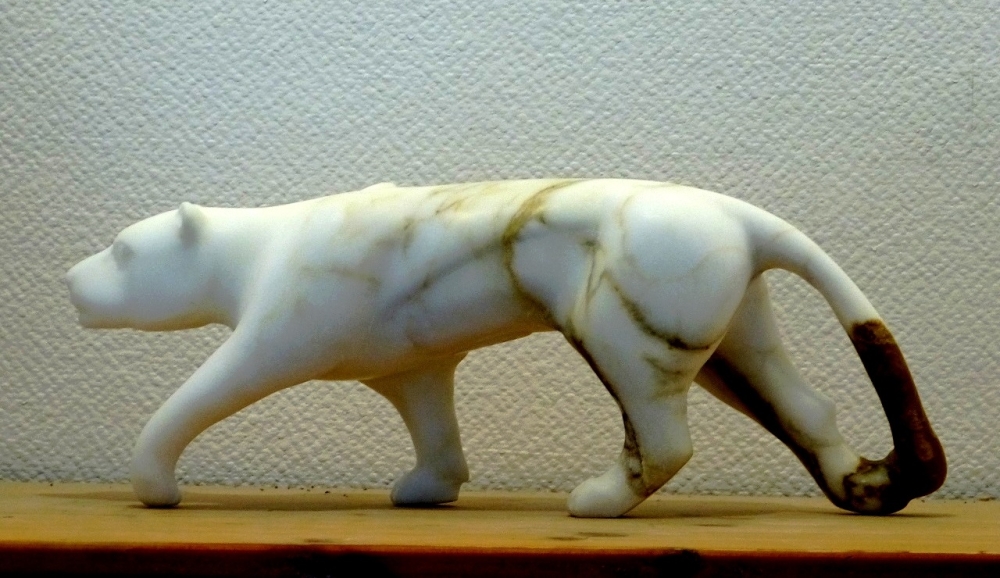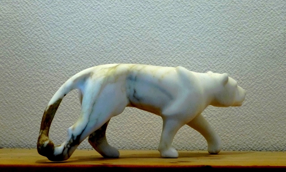 Statuette sculptée dans un bloc de Marbre blanc de Carrare (Italie), qualité Bianco Calacatta. Sculptée manuellement, par taille directe dans mon atelier à Mougins. Pièce unique neuve. Dimensions H:12 L:35 P:8 cm. Signature gravée sur le ventre de l'animal. Certificat d'authenticité signé par l'artiste.