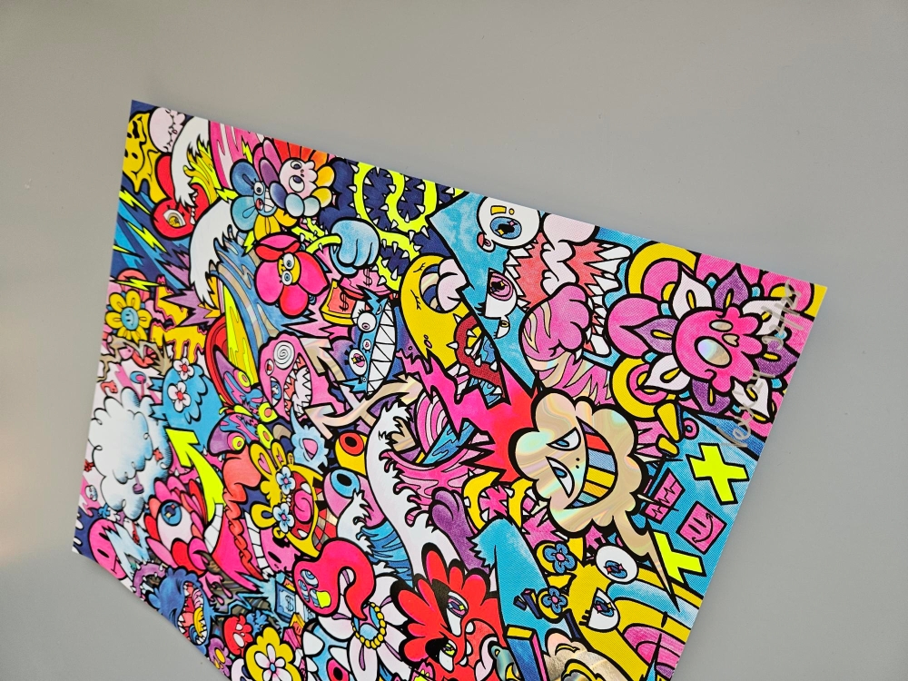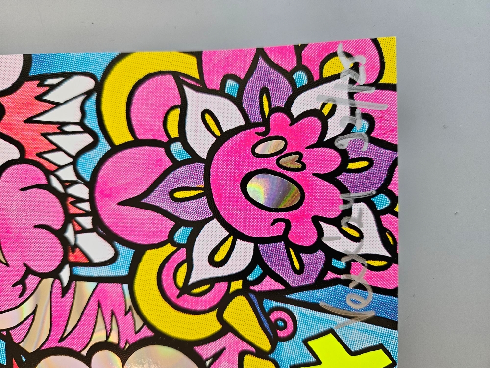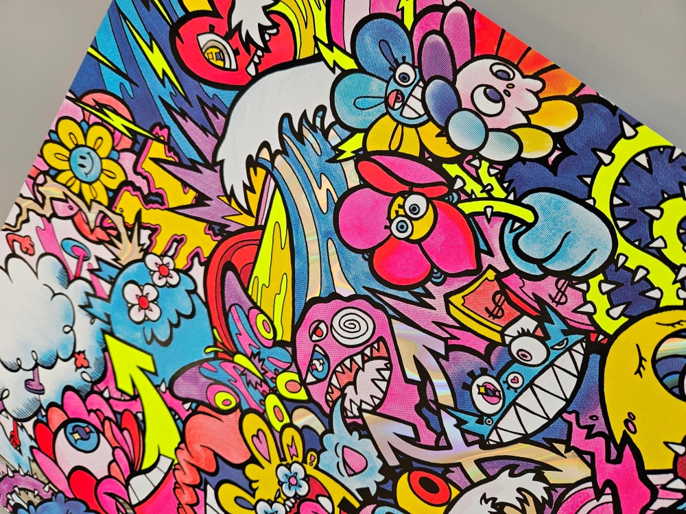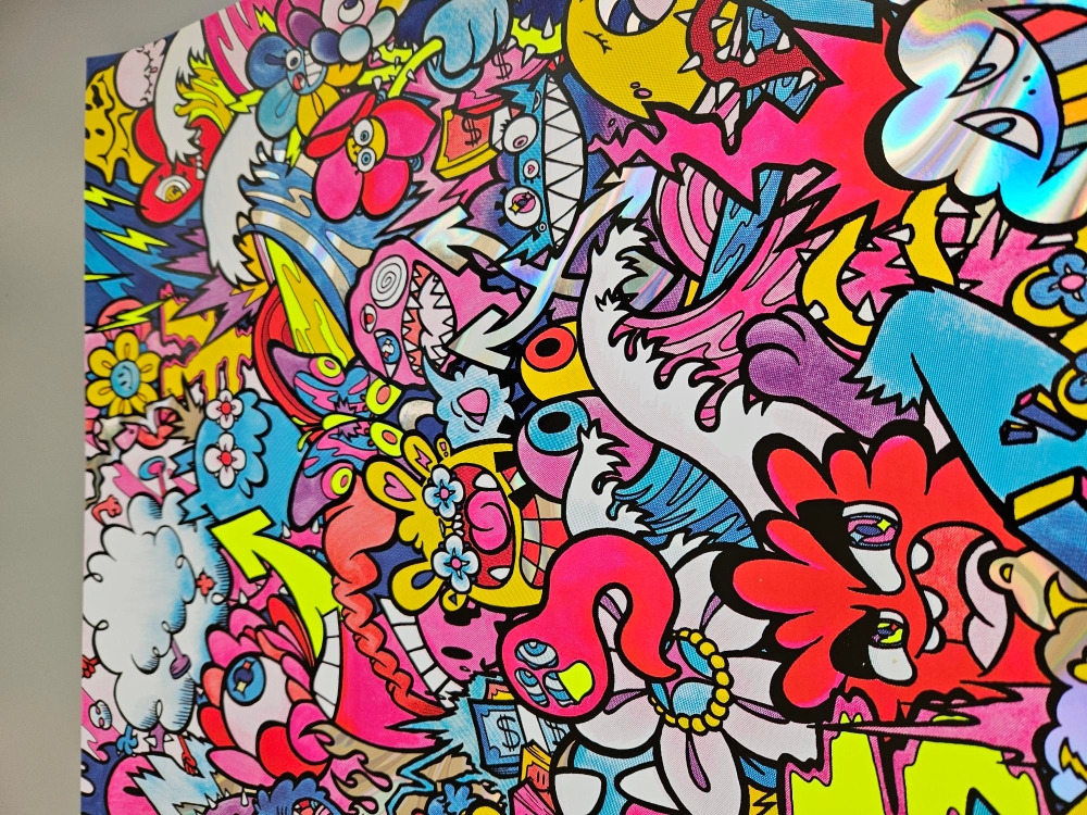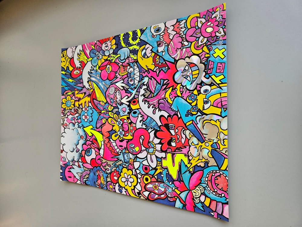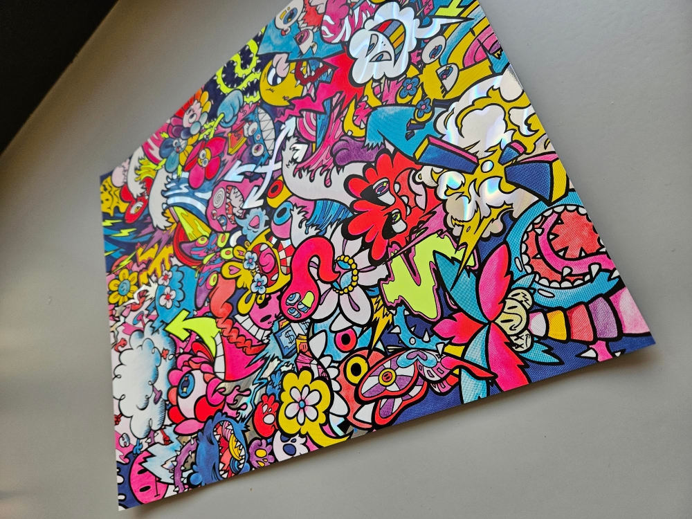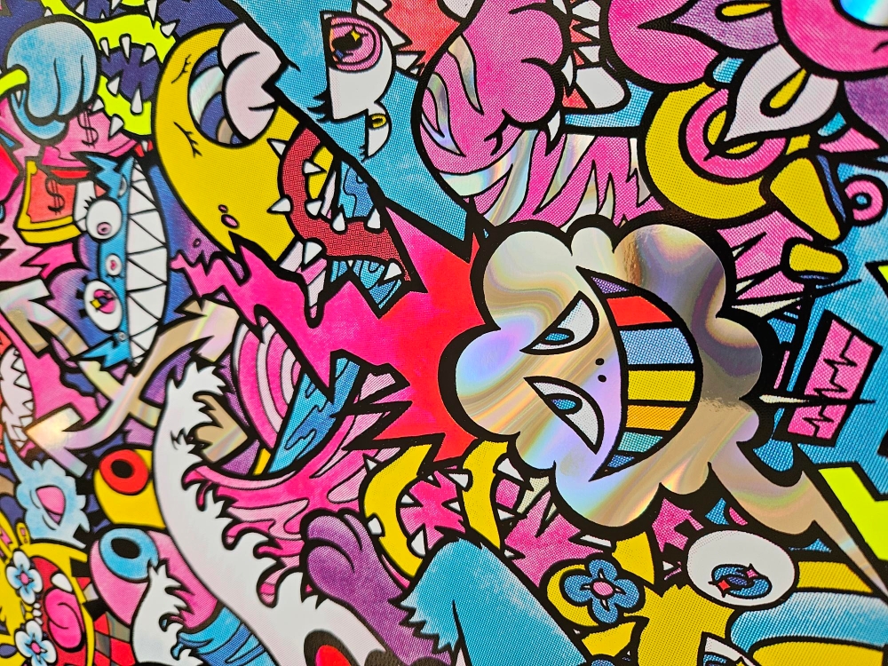 Mooi werk van Vexx, limited edition print van 125 stuks. 8 kleuren zeefdruk + spotvernis & gele fluorescerende inkt + lavaholografisch effect De print is met de hand ondertekend, reliëf en genummerd door de kunstenaar Vexx. Vince Okerman (1998), online beter bekend als Vexx, is een Belgisch kunstenaar die bekend is met zijn doodles, zogenoemd doodle art.