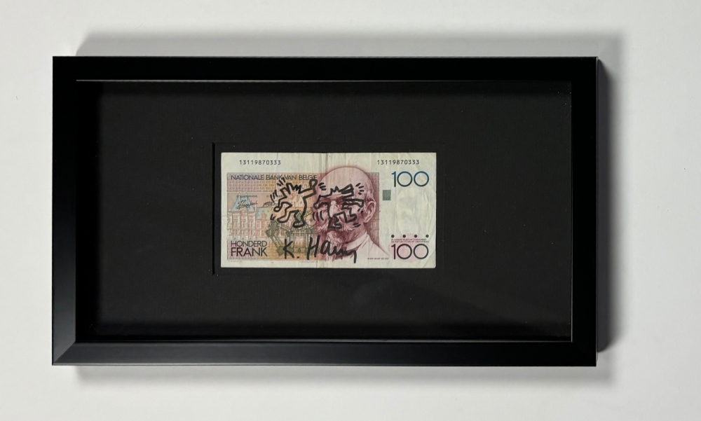Original drawing by Keith Haring on a 100 Belgian Franc note. Professionally framed. Shipping and collection possible.