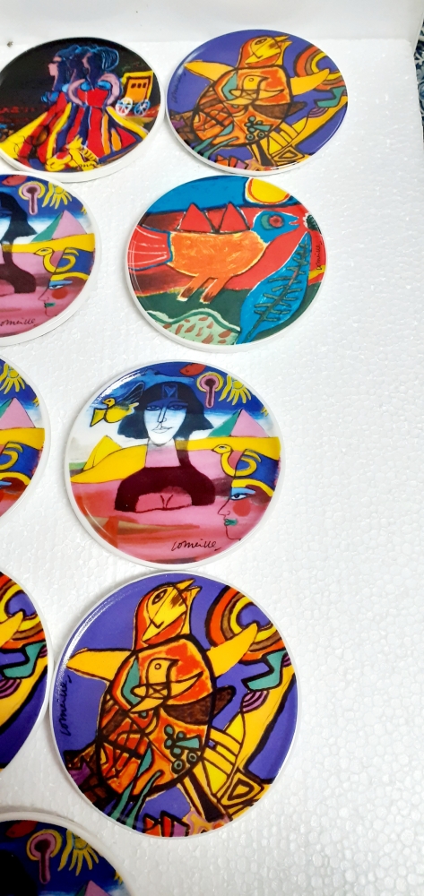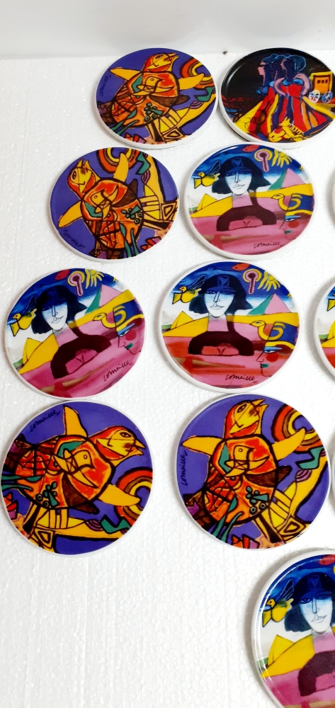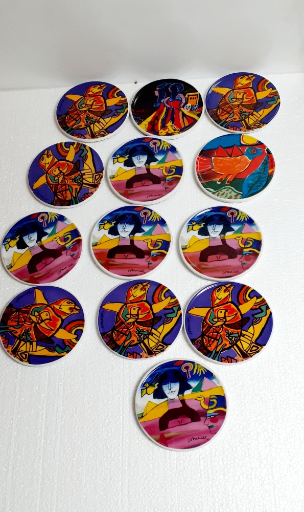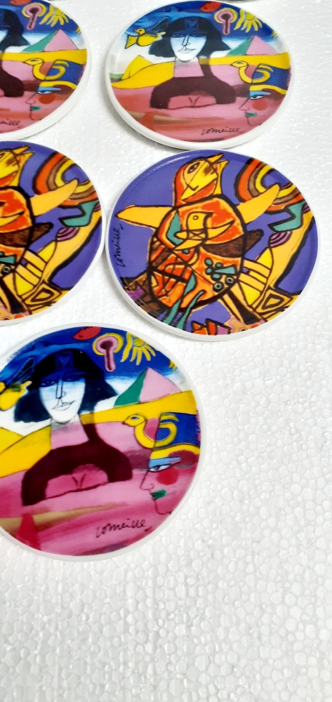 Bijzondere Uitgaves Corneille (1922-2010) Set van 13 keramische Corneille Onderzetters Ze zijn zeer kleurrijk Bovendien heeft de onderkant een beschermlaagje van rubber Diameter: 10,5 cm In goede staat Getekend: Corneille.