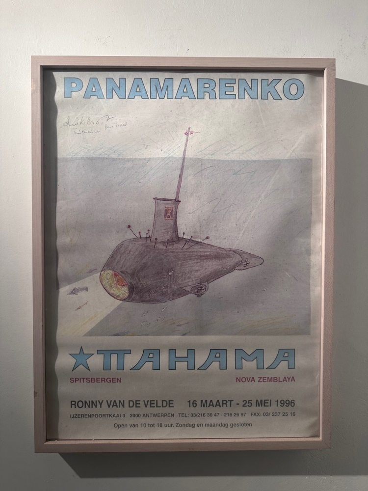 Tentoonstellingsaffiche uit 1996. Mooi ingelijst. Panamarenko, de artiestennaam van Henri Van Herwegen was een Belgisch beeldhouwer. Hij wordt beschouwd als een van de voornaamste Belgische beeldhouwers uit de tweede helft van de 20e eeuw. Hij maakte veel assemblages die met vliegen te maken hebben