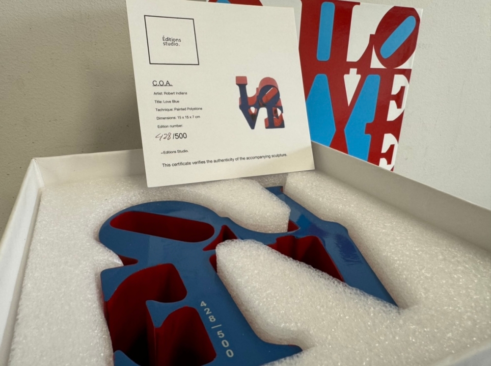 LOVE by Robert Indiana. Only 500 coins issued worldwide. This is number 428. The original packaging and certificate of authenticity are present. This item will be shipped insured. At auction, this sculpture reaches prices of €1,000 and more. However, this statue is offered without a minimum price. LOVE is a sculpture of Robert Indiana created in 1970 by the American artist Robert Indiana. The representation is formed by the letters "LO" stacked on top of the letters "VE" and forms a globally recognized icon of the pop art era.