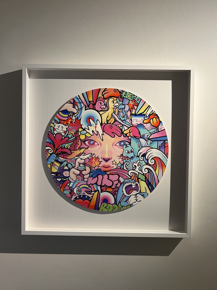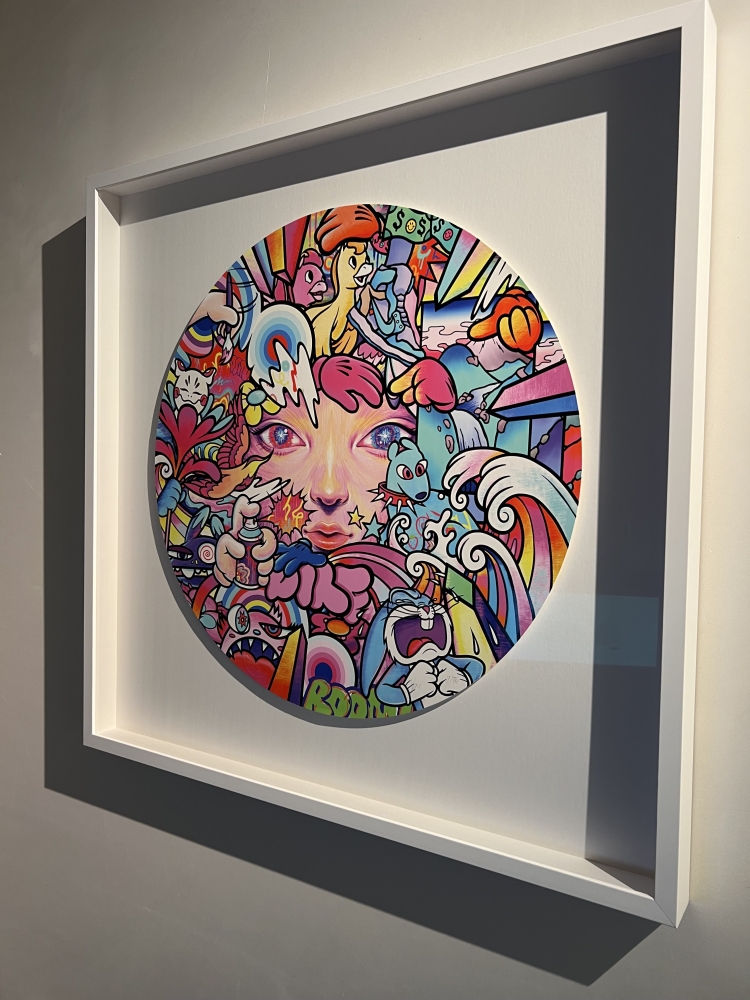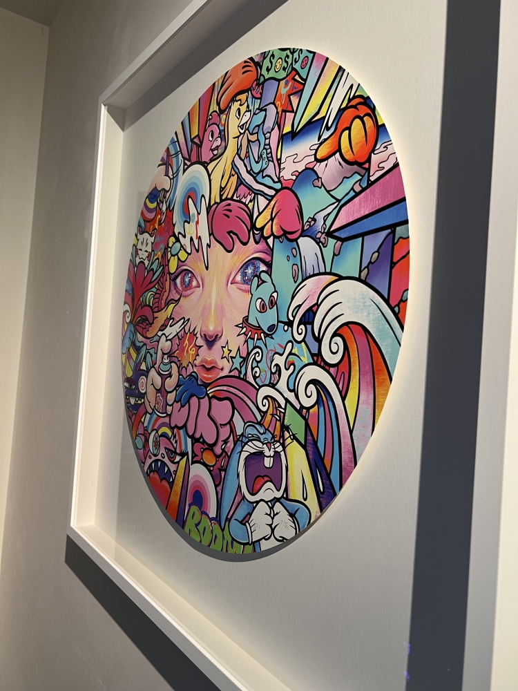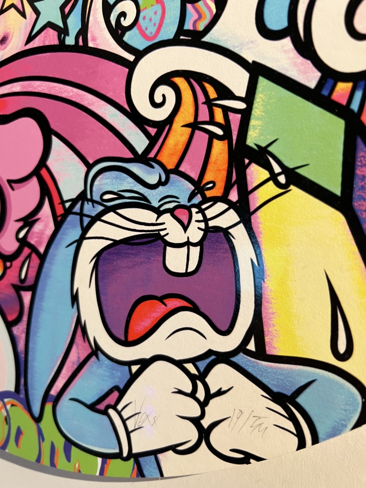 Dark Side Of The Rainbow is een limited edition zeefdruk van 44 stuks. Print werd verkocht aan 10.000 USD, zeer zeldzaam gezien beloning voor NFT eigenaars van dit werk. Hier wordt het exemplaar 19/44 verkocht, dewelke met de hand gesigneerd is door VEXX. Ingelijst met ontspiegeld glas 2mm 70% UV, rond werk - zwevend in kastkader. (professioneel door ArtFrameCenter Brugge)