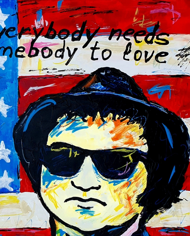 Uniek werk, uit een serie schilderijen ''R & R forever''in Street/Pop art stijl, van de Nederlandse professionele / hedendaagse kunstenaar Jovan Srijemac (1962). Werk is geschilderd met acrylverf acryl marker, sprei,. Schilderij is met de hand gesigneerd, met certificaat van echtheid, is gelakt en klaar om op te hangen. De zijkanten zijn geschilderd als onderdeel van het schilderij en hoeven niet te worden ingelijst. Dit werk past goed in een modern interieur of kantoorruimte. "De chaos van ideeën die in mijn hoofd zijn ontstaan, het innerlijk verstoken van energie, wil als een vulkaan naar buiten komen en zo een explosie worden en een symfonie van kleuren op het doek, omlijst met materie, figuren, gezichten of abstracte compositie" . Mijn werk ligt dicht bij de expressionistische stijl, maar ik experimenteer graag met pop-art en action painting. Mijn werk uit de jaren tachtig was surrealistisch. Ik wilde een bericht sturen naar de kijkers. Het hoofdthema ging over het leven in de wereld, tegen de oorlog. In de jaren 90 was mijn werk somber, donker van kleur, net als mijn gevoelens. Ik ben begin jaren negentig uit mijn land (voormalig Joegoslavië) ontsnapt toen de oorlog uitbrak. In de jaren '00 was ik op zoek naar kleur. eindelijk gelukt tot nu toe. Mijn werk is nu kleurrijk, abstract expressionistisch. Het meeste werk is geschilderd met een paletmes. Er is kleur op het doek aangebracht met een gevoel en emotie die diep uit mijn ziel komt. Thema is minder belangrijk als ik tevreden ben met de compositie en kleur. Experimenteren in de kunst, met stijlen, technieken, kleuren etc, vind ik erg belangrijk. Ik denk: "Als je als artiest je hele leven vasthoudt aan één stijl, dan ben je als artiest dood." In de kunst en in het leven is er voor mij één doel: doorgaan! En ik zeg vaak: "We weten pas wat er achter de gesloten deur verborgen zit als we hem openen" Citaat uit mijn boek: ''Apocalypse of the soul''