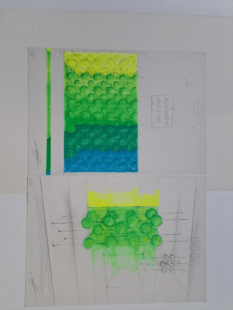 2 Offset lithographs after the design of Sergio De Beukelaere for his contribution to the Museum to Scale project by Ronny Van De Velde in 2013. including accompanying folder 50x72 cm with the name of the artist in intaglio print numbered 48/75 and hand signed OPM: 2 separate offsets of 50x35 cm!
