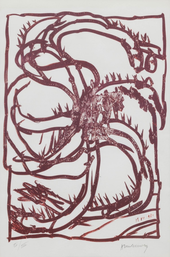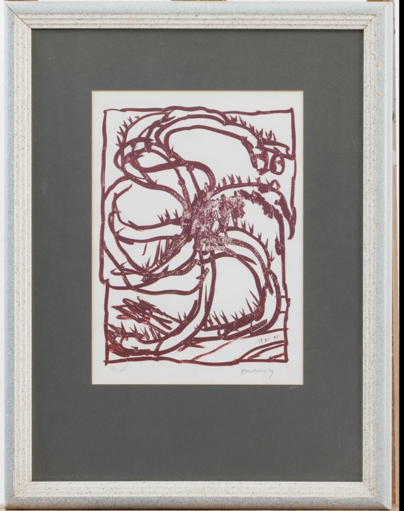 Mooi werk van Alechinsky. Gesigneerd en genummerd met Romeinse cijfers XXV. Alechinsky volgde van 1944 tot 1948 een opleiding in de toegepaste grafische kunsten, (boek)illustratie, typografie en fotografie aan de École nationale supérieure des arts visuels (ENSAV), voorheen de École nationale supérieure d'Architecture et des Arts décoratifs (ENSAAD - la Cambre) (Ter Kameren) te Brussel. Hij ontdekte in 1945 het werk van Henri Michaux en Jean Dubuffet en ontwikkelde een vriendschap met de kunstcriticus Jacques Putman, die verscheidene werken aan Alechinsky wijdde. In 1947 startte hij zijn schildercarrière en sloot hij zich aan bij De Jonge Belgische Schilderkunst en had ook zijn eerste solotentoonstelling te Brussel