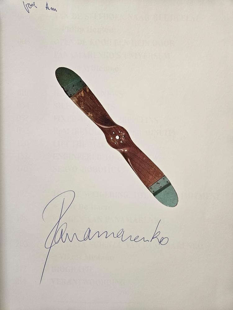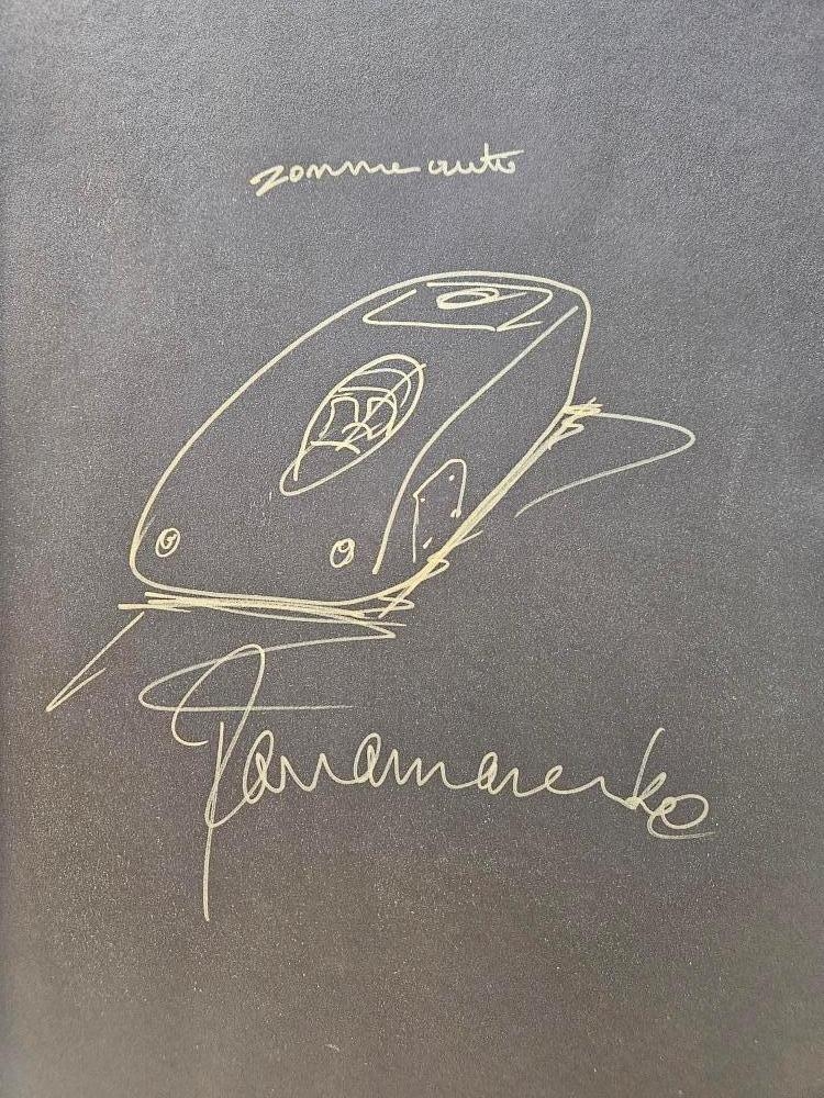 Prachtige originele tekening van Panamarenko. Een tekening van de Zonneauto, één van de meest tot de verbeelding sprekende creatie van de kunstenaar. De tekening is in goudstift. Getiteld "Zonneauto" en gesigneerd. De tekening is gemaakt in het boek Panamarenko Universum, op de volgende bladzijde is het boek nogmaals gesigneerd door de kunstenaar.