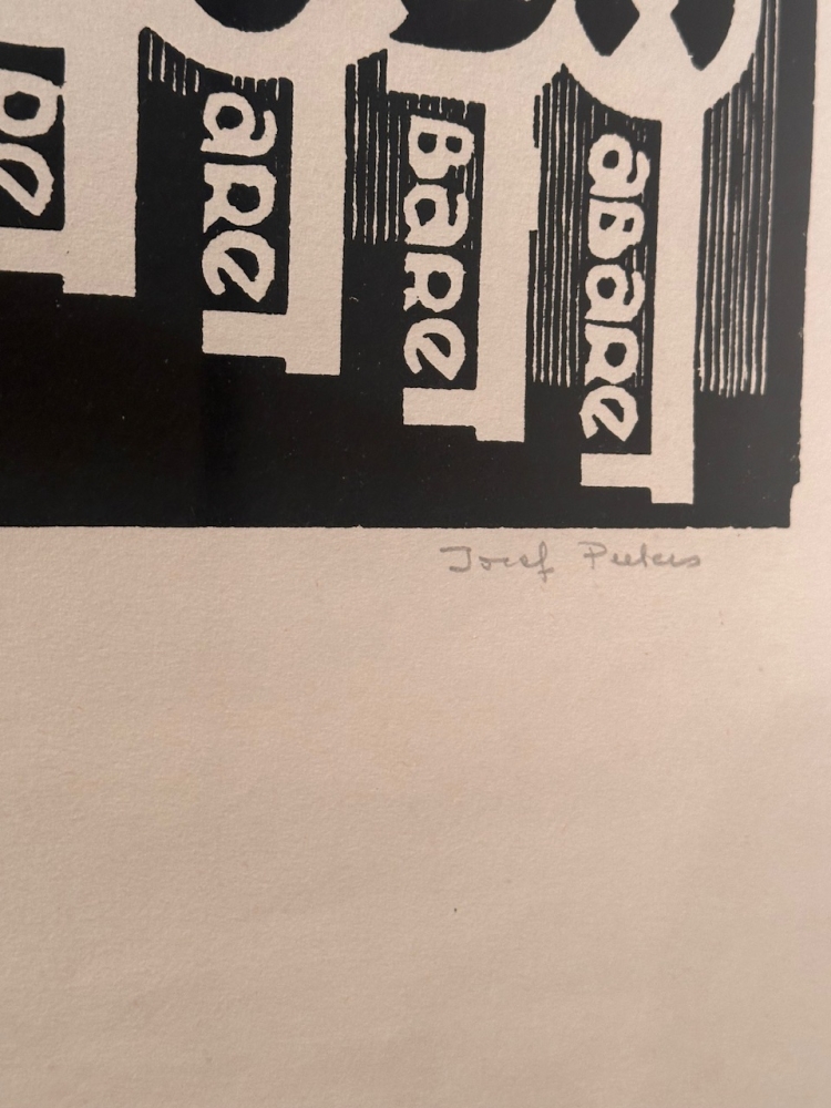 Zeer zeldzame linosnede. Met de hand gesigneerd en genummerd op 250 ex. Josephus Henricus (Jozef) Peeters (Antwerpen, 24 juli 1895 – 10 september 1960) was een Belgisch graficus en schilder. Hij wordt beschouwd als een van de eerste Belgische abstracte kunstenaars. Hij was zoon van Henricus Camillus Peeters en Paulina Albertina Henrica Beruck. Zelf trouwde hij met Pelagia Pruym.