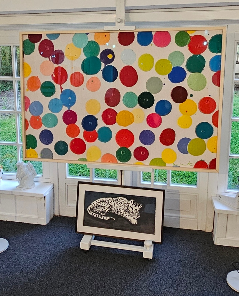 Originele print uit de Currency project van Damien Hirst. Bijzonder groot formaat! 150 x 100 cm. Voor dit project werden 1000 unieke prints gemaakt. Iedere print is dus uniek. Gesigneerd en genummerd op 1000 exemplaren. Ingelijst met ontspiegeld museumglas.