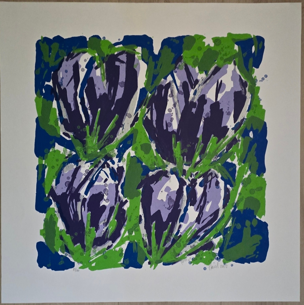 Zeefdruk van Ad van Hassel - Paarse Tulpen Afmeting blad: 70 x 70 cm. Afmeting beeld: 60 x 60 cm. Gesigneerd: Hand gesigneerd met potlood Oplage: 100 ex. Wordt geleverd inclusief certificaat van authenticiteit Verzending goed verpakt in koker en aangetekend/verzekerd
