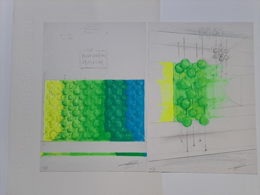 2 Offset lithographs after the design of Sergio De Beukelaere for his contribution to the Museum to Scale project by Ronny Van De Velde in 2013. including accompanying folder 50x72 cm with the name of the artist in intaglio print numbered 48/75 and hand signed OPM: 2 separate offsets of 50x35 cm!