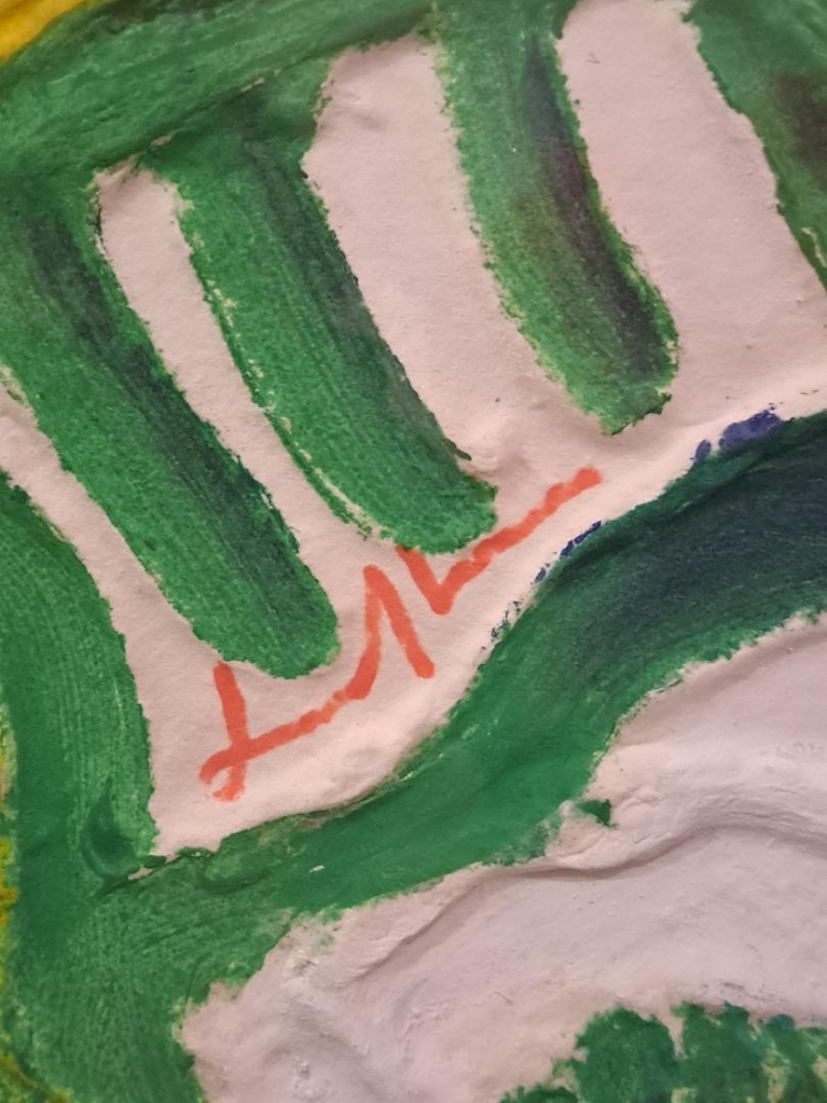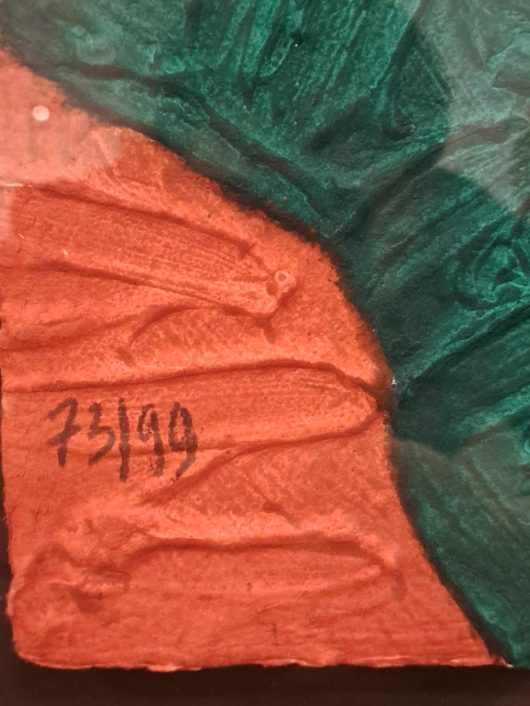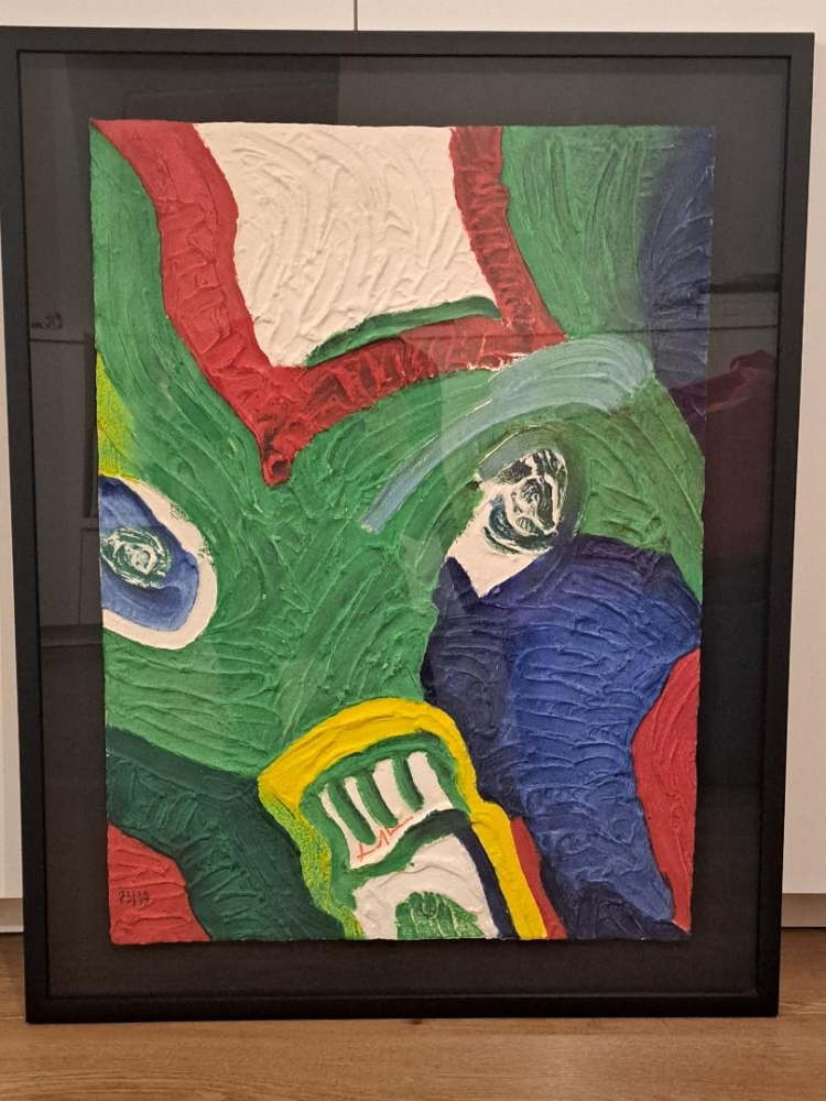 Bengt Karl Erik Lindström was born in 1925 Lapland Sweden where the Sàmi king was his godfather and died after suffering a stroke in 2003 in 2008 Sweden. Bengt Lindström's Lapland filled his artworks with a bold presence of color, shape and figures referencing the legends and stories of mystical beings with usually distorted faces. Typical large aqua engraving from 1997. Beautifully floating framed in a black wooden frame