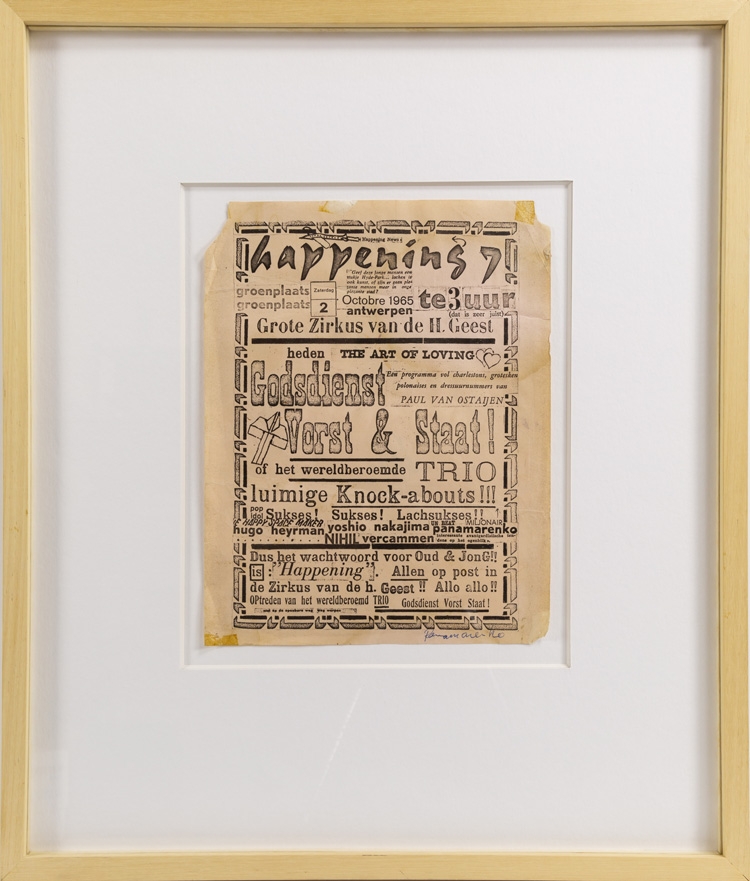 Unique print signed by Panamarenko. This is a museum piece shown in the museum Marta Herford. This work comes from Jan Hoet. This is an announcement of a Happening at the Groenplaats in Antwerp. With certificate of authenticity issued by the PanamarenkoShop. Panamarenko started his career in the 1960s as a pacesetter for various happenings, playful street performances that he orchestrated in the center of Antwerp. Happenings are not limited to one art discipline. They take place in small spaces, outdoors and sometimes even in several places at once. The starting point of the happening is not so much art, but life itself. Because human action is central and coincidence plays a major role, the result is usually not fixed in advance