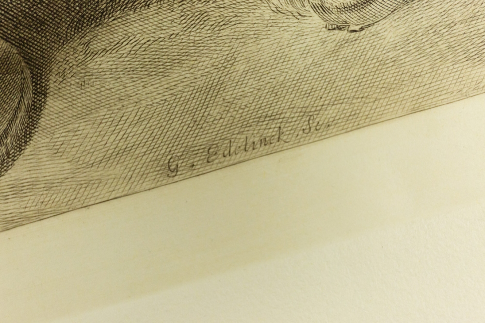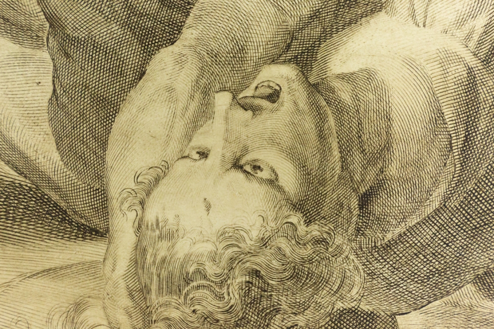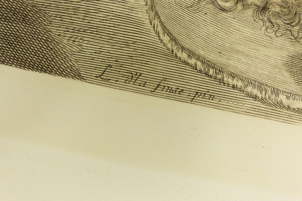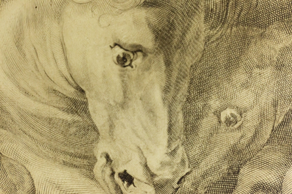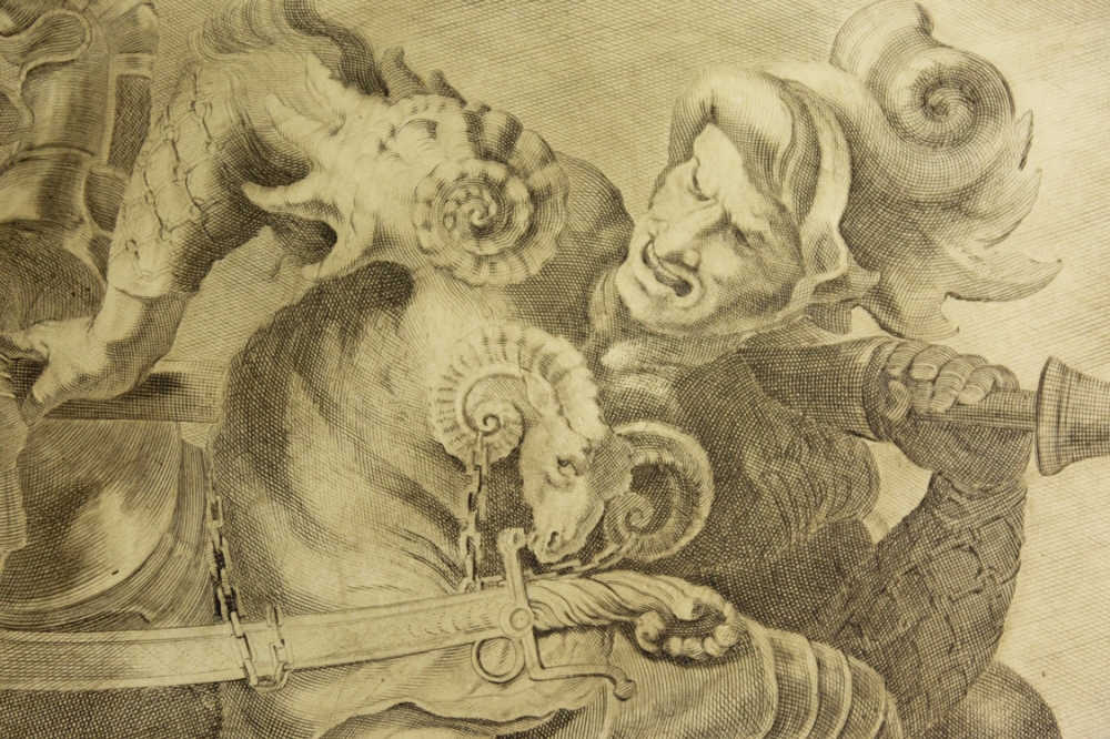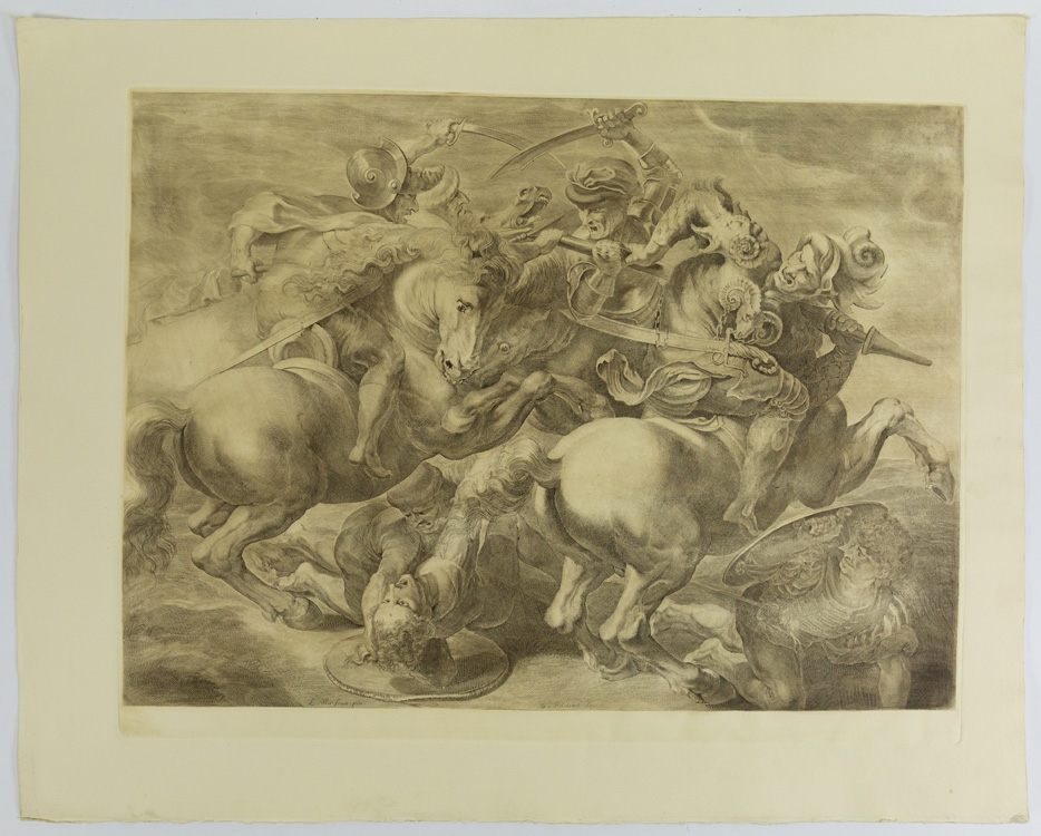 Etching by Gérard Edelinck (1640 - 1707), after Leonardo da Vinci. A copy of this etching is also owned by the Rijksmusuem. Read more via this link. Fight between four soldiers with sabers and spears on horseback and two men on the ground. A seventh man takes cover under his shield. Engraving with a plate edge of 46cm x 61.9cm. Last auctioned at Christies in New York from 5,470.