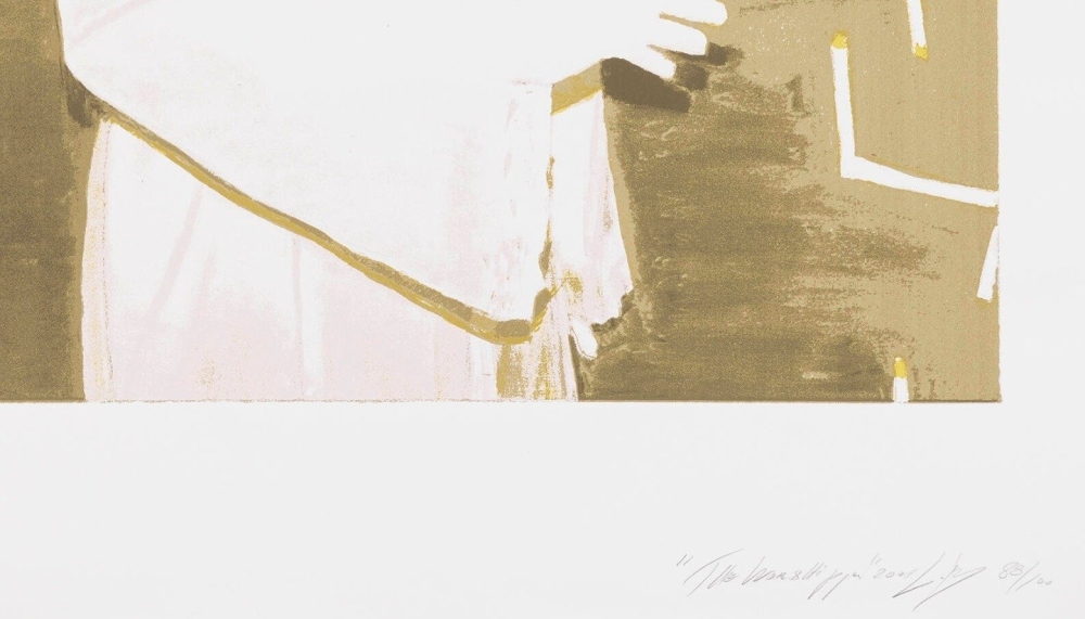Mooi en zeer grote werk van Luc Tuymans. Gesigneerd, getiteld, gedateerd en genummerd met de hand in onderhoek The Worshipper 2005 L. Tuymans 88/100. Dit werk is nummer 88 uit een editie van 100. Beeld: afmeting 81 × 63 cm Plaat: 104 × 74 cm