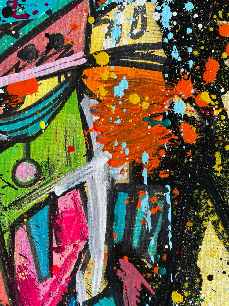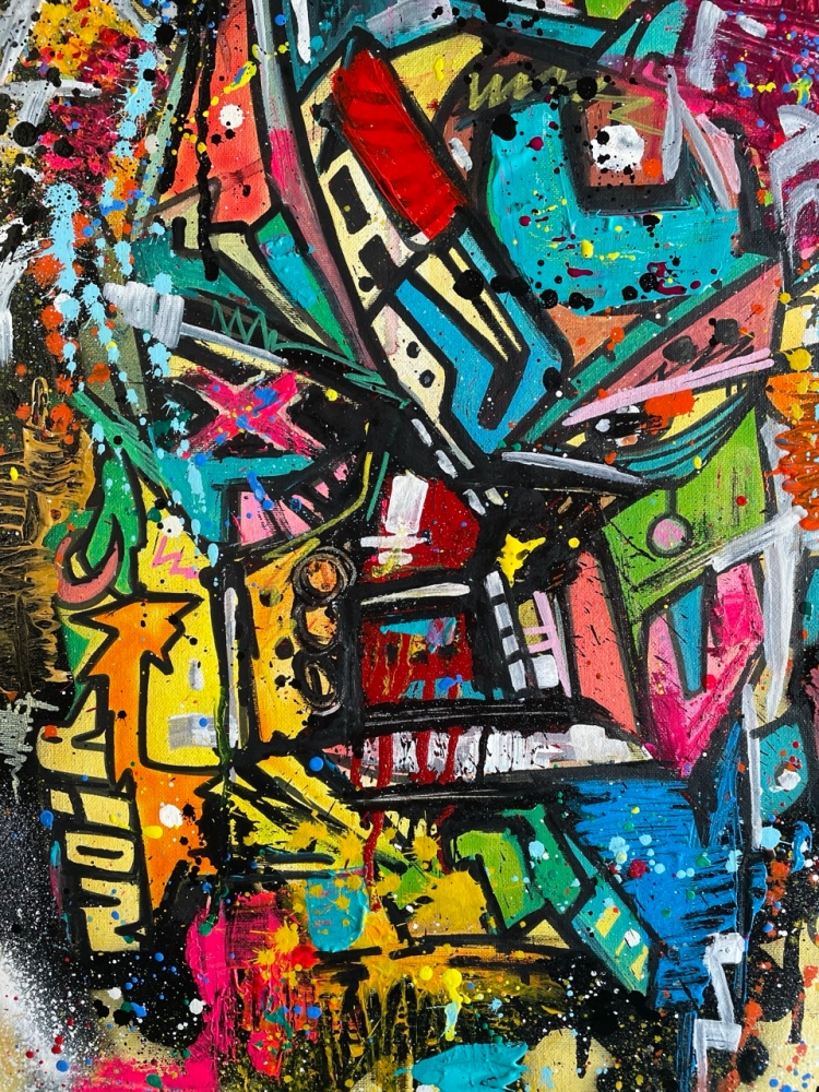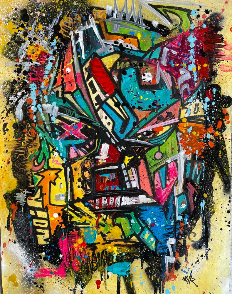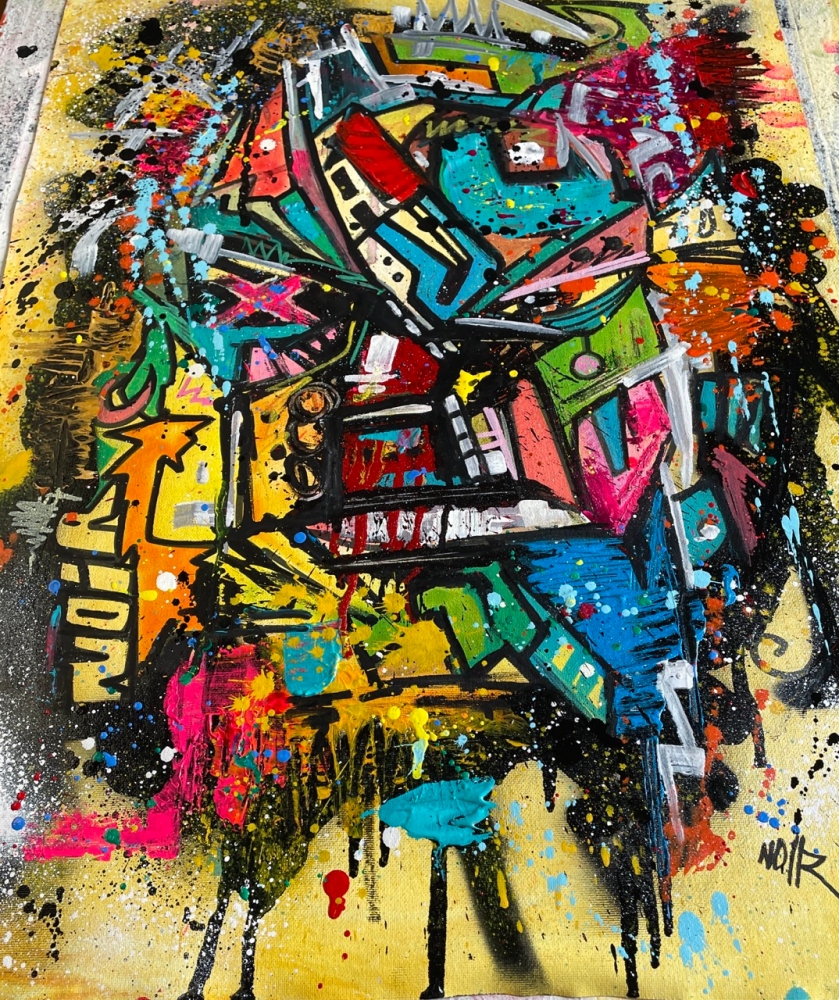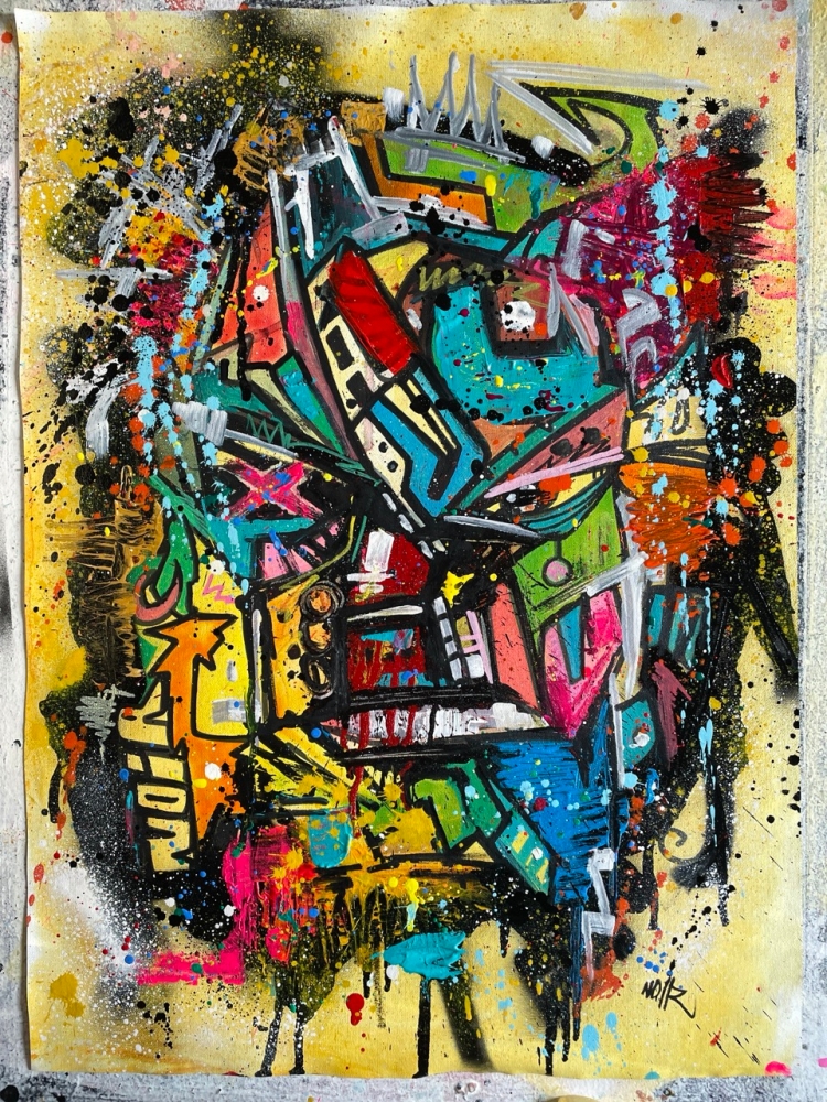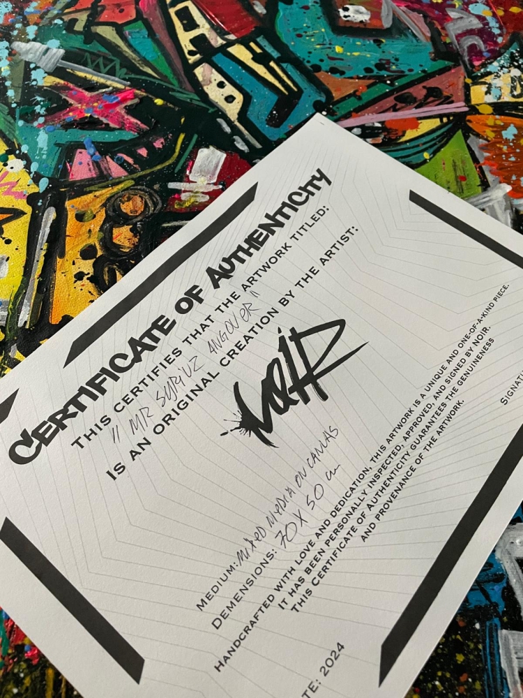 COLLECTOR'S ITEM! "Mr Syriuz Angover" Introducing an exceptional interpretation of this Noir's piece, this artwork is a mixed media on canvas titled "Mr Syriuz Angover" This exclusive edition highlights the artist's passion In every stroke, Noir's work reflects an unwavering commitment to the art form. -This is a unique work of art, hand-signed and with a certificate of authenticity, delivered to your door. -Sent rolled in a tube. -This is a Mixed Media Artwork on canvas, so you should expect some flaws, imperfections splatters, small cracks or wrinkles can also happen, and when it does, it's part of the artwork. This is just the nature of the spray on canvas. -Sent rolled in a tube. -Colors may shift due light conditions at the moment of the photo. *do not leave it in the tube Noir, a passionate artist, discovered her deep-seated love for Urban art and Illustration from a tender age. Over the years, Noir's artistic journey has unfurled, expanding the skills into various creative realms, including concept art and digital painting, music, 3d sculpt and traditional painting.