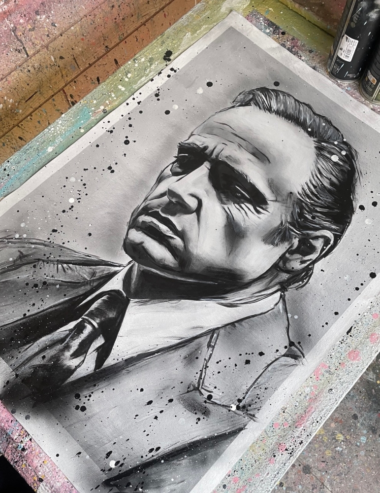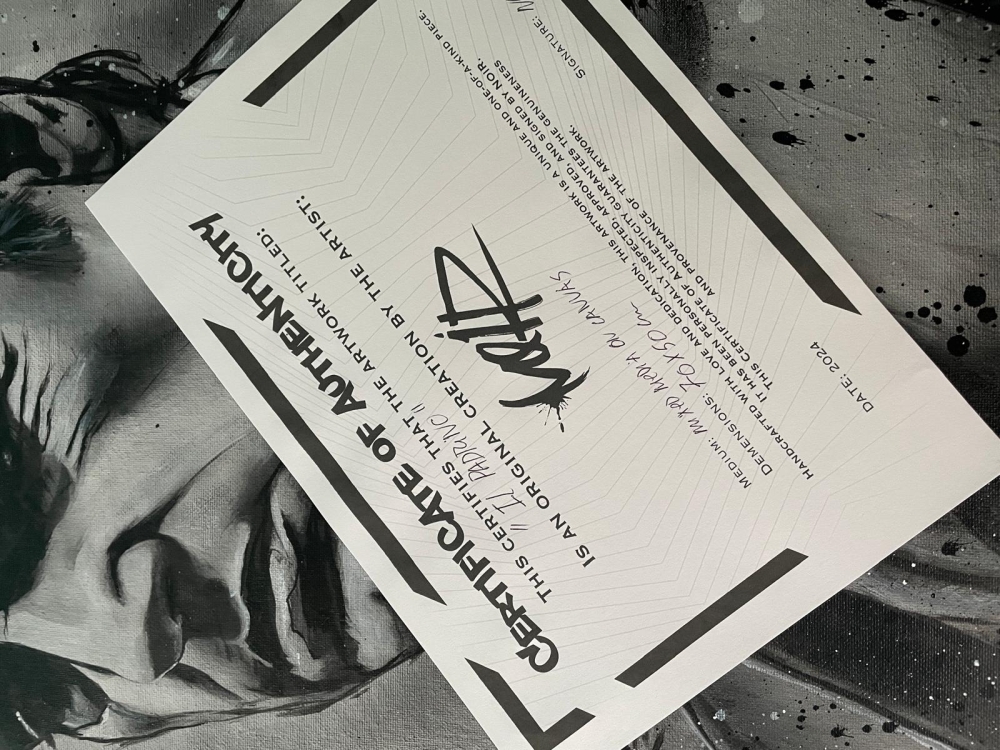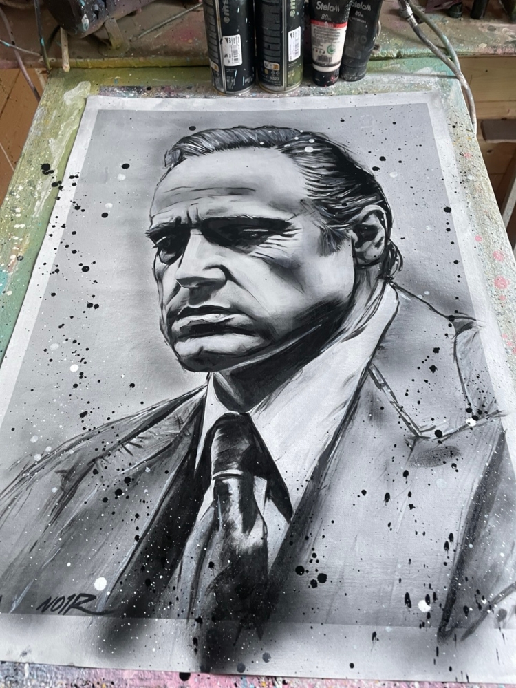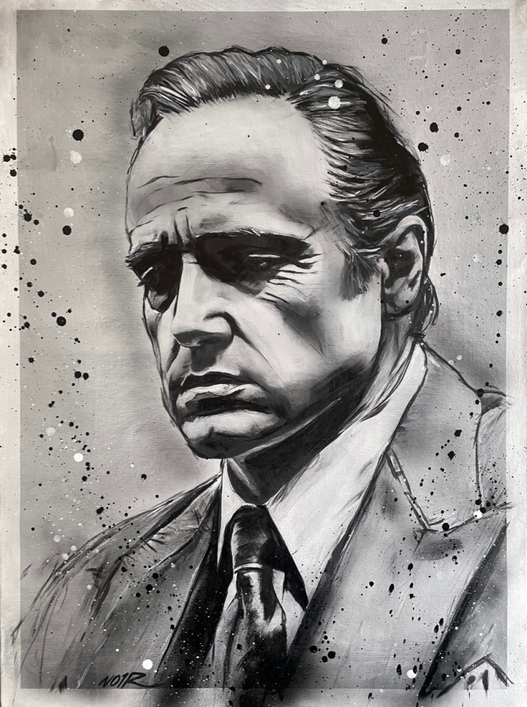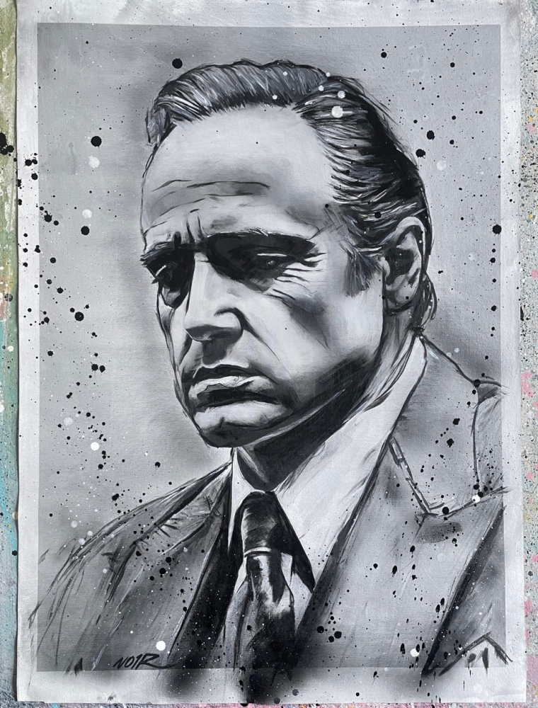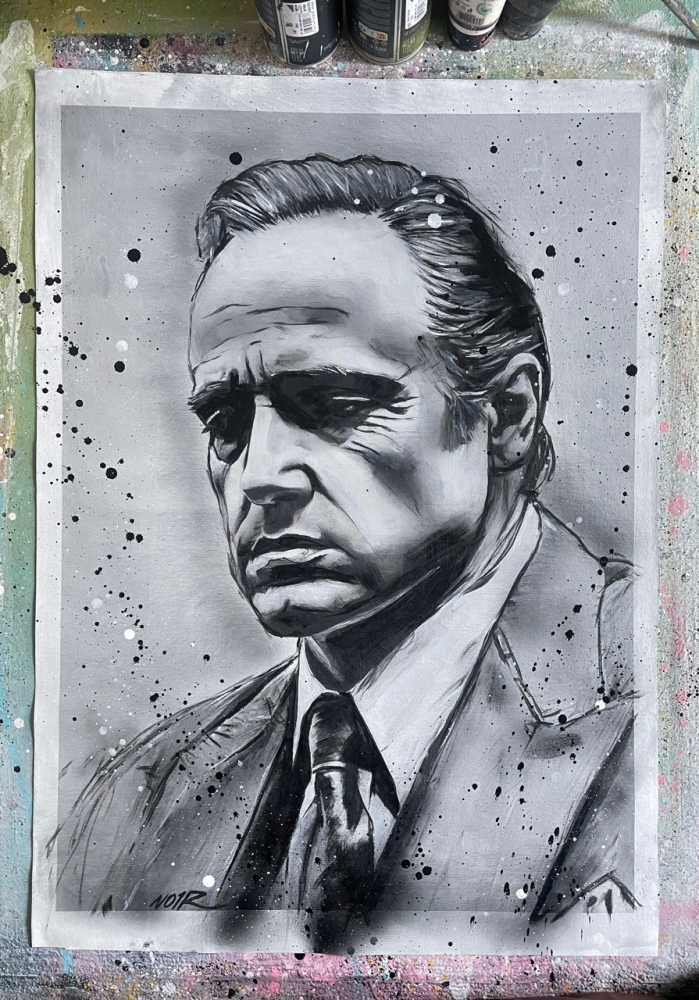 COLLECTOR'S ITEM! "Il Padrino" Introducing an exceptional interpretation of this Noir's piece, this artwork is a mixed media on canvas titled "Il Padrino" This exclusive edition highlights the artist's passion In every stroke, Noir's work reflects an unwavering commitment to the art form. -This is a unique work of art, hand-signed and with a certificate of authenticity, delivered to your door. -Sent rolled in a tube. -This is a Mixed Media Artwork on canvas, so you should expect some flaws, imperfections splatters, small cracks or wrinkles can also happen, and when it does, it's part of the artwork. This is just the nature of the spray on canvas. -Sent rolled in a tube. -Colors may shift due light conditions at the moment of the photo. *do not leave it in the tube Noir, a passionate artist, discovered her deep-seated love for Urban art and Illustration from a tender age. Over the years, Noir's artistic journey has unfurled, expanding the skills into various creative realms, including concept art and digital painting, music, 3d sculpt and traditional painting.