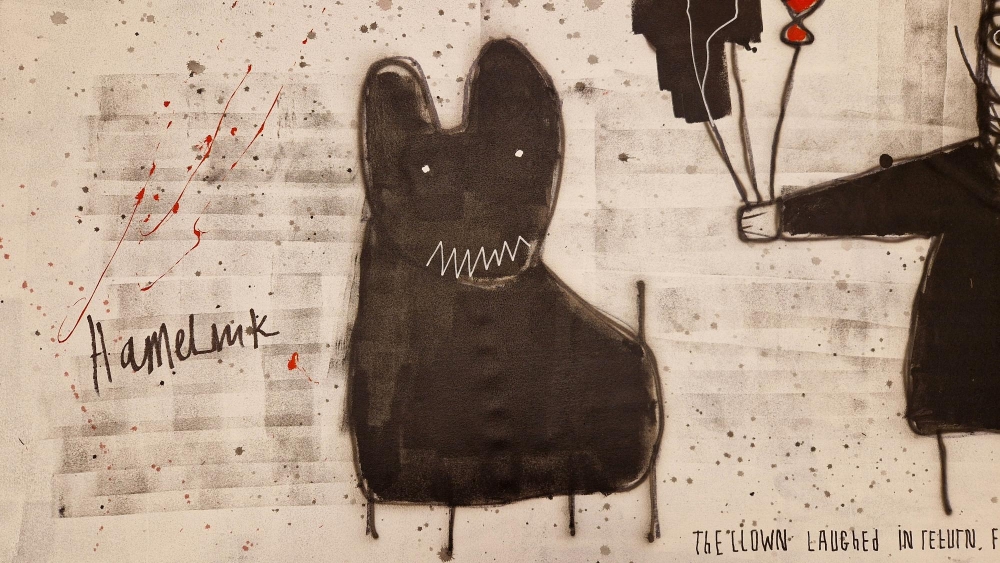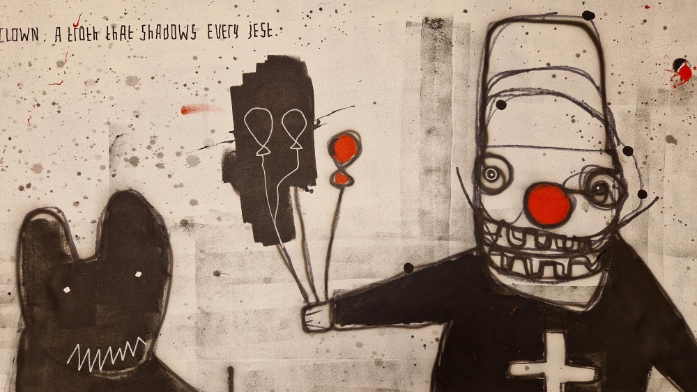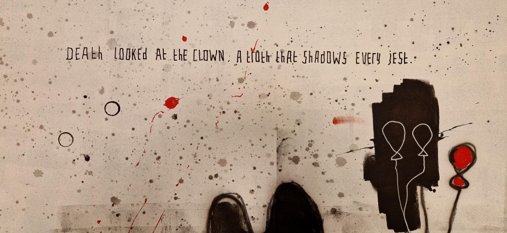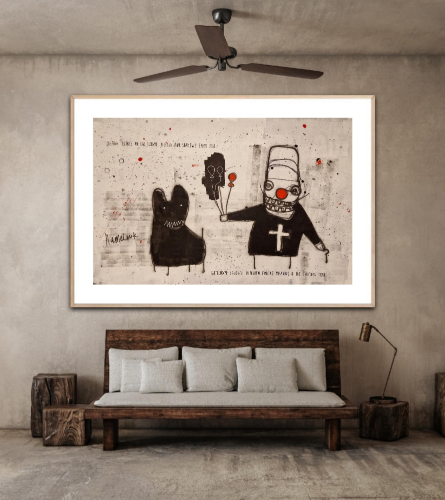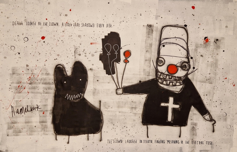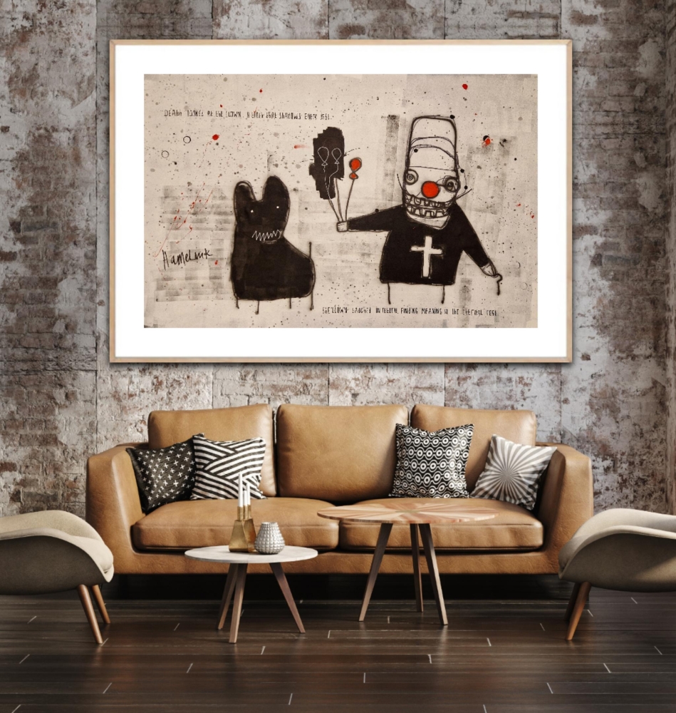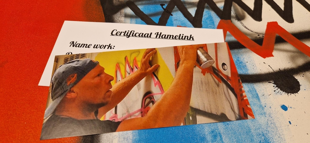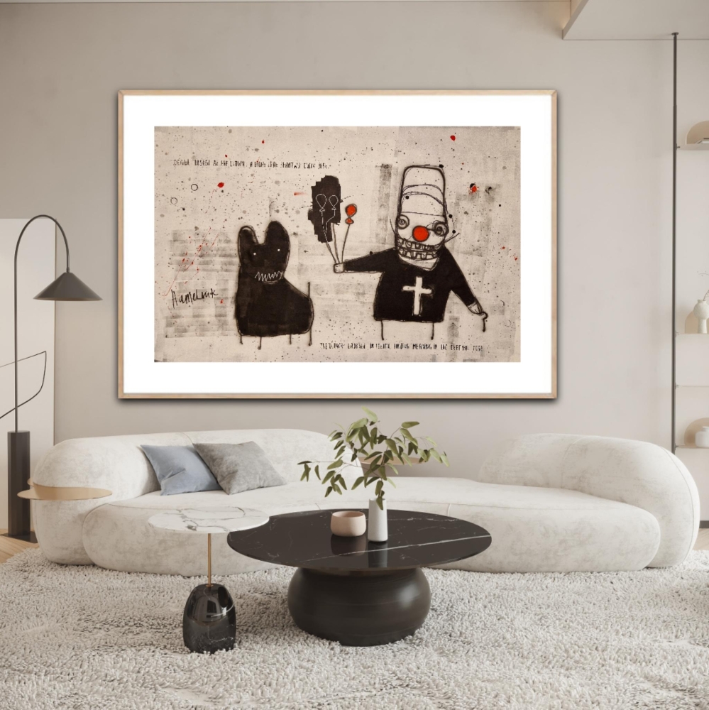 NB ! The work of art is delivered without a stretcher frame, to prevent this due to transport costs and damage. (The work is made on a piece of cotton canvas measuring (210 cm x 160 cm). Death looked at the clown, a truth that overshadows every joke, the clown smiled back, Bart Hamelink, an emerging Dutch artist, is known for his daring experiments with modern techniques and traditional influences. His recent work emphasizes this innovative approach, in which he plays with different media such as graffiti, airbrush and acrylic paint. A good example of this is his work Sound Waves of Color, in which sound waves and colorful abstract figures are combined to capture movement and energy. This dynamic style is characteristic of Hamelink's continuous search for new forms of expression within the contemporary art world. The canvas is carefully rolled up and securely packed in a sturdy square tube for shipping. Delivery is without stretcher frame! This protects it from damage and reduces transportation costs. The risk of damage is minimized, while the art reaches its destination safely. Each work of art comes with a certificate of authenticity, signed by Bart Hamelink himself, confirming the authenticity and value of the work The image Discover more about Bart Hamelink at www.barthamelink.com