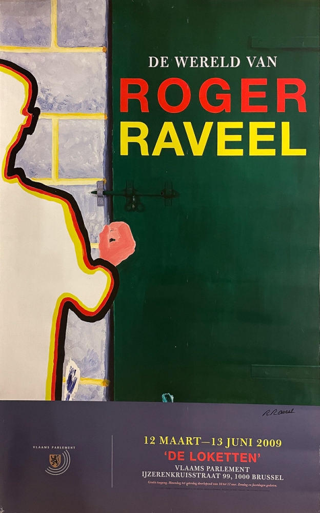 Poster voor de expositie van De wereld van Roger Raveel. Deze expo ging door in de loketten van het Vlaamse Parlement. 12 Maart - 13 Juni 2009. De poster is met de hand gesigneerd door Roger Raveel. De poster bevat gebruikssporen.