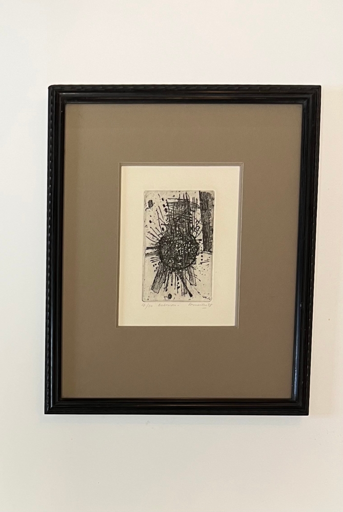 Etching on Rives BFK Image: 139 mm x 90 mm - Total paper dimensions: 331 x 249 mm Size with frame : 40.5 cm x 33.5 cm Atelier Leblanc, Paris Commercial edition of 20 copies. This is no. 16/20 Atelier Corneille stamp on the back. Referenced in the Donkersloot catalogue raisonné n°52, page 84 Eclosion is the testimony of a lived experience. Fascinated by the work of Lévi-Strauss and the first film reports on Africa, Corneille (1922-2010) and his first wife Henny Riemens (1928-1992) embarked on the mad project of crossing Africa from East to West from the River Niger, over several months from 1956 to 1957. Corneille experienced a black sun in the desert, in a geological landscape where the four elements merged. Mineral becomes vegetable and vice versa. Eclosion is both a sunrise and a description of the birth of a plant. In the catalogue of the exhibition at Colette Allendy in 1954, the art critic Charles Estienne identified in Corneille's work an abstraction in germination, that is to say, an abstraction in the making, never far from figuration, and called for a multiplicity of meanings. The black sun will be a recurring motif in Corneille's work. Secure delivery by UPS.