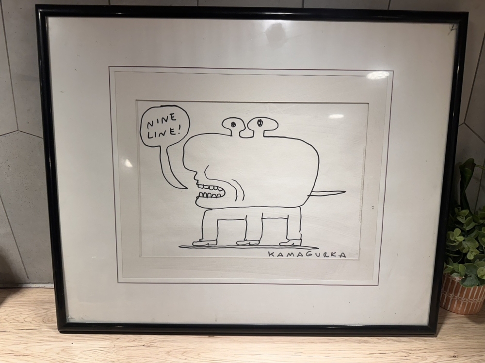 Originele tekening op papier Gesigneerd en getiteld. Zeer goede staat. Klein barstje in het glas rechtsboven Kamagurka, pseudoniem van Luc Charles Zeebroek, is een Belgisch cartoonist, theater- en televisiemaker, zanger en allround kunstenaar