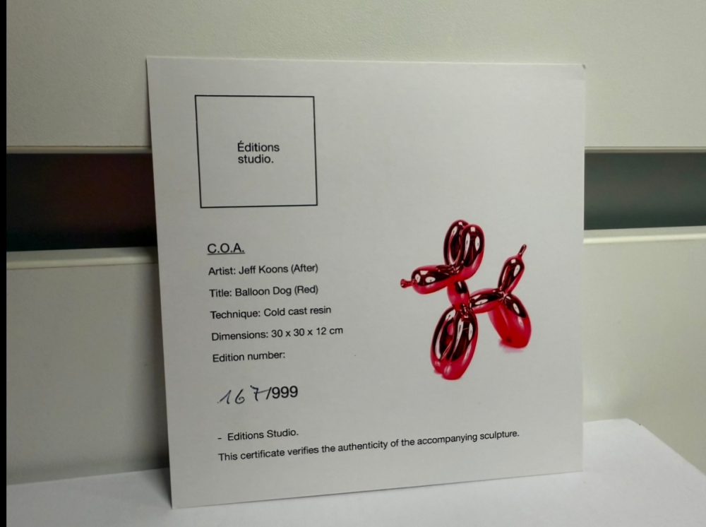 Resin sculpture after Jeff Koons, published by Éditions Studio. Limited edition of 999 copies, of which this number is 167. The sculpture is delivered in its original packaging and is accompanied by the original certificate. The sculpture is in good to excellent condition. Red & Blue are the most rare colors and sold out in 3 minutes after the release. Sale of private collection.