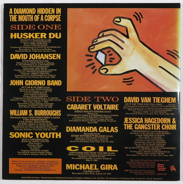 Whether he was working with Grace Jones, Andy Warhol or Jean-Michel Basquiat, regularly visiting clubs like Paradise Garage with friend Larry Levan, or drawing cartoon DJs, the work of New York artist and activist Keith Haring was deeply intertwined with the music world. Although Haring died at the age of 31, he produced art at a blinding speed and as such was enormously productive. His creations adorned album covers by punks, pop stars and burgeoning hip-hop names, and he lent his vision of sound to everyone from David Bowie and Sylvester to DMC and Crystal Waters in the 1980s LP cover designed and hand signed by Keith Haring, for the album A Diamond hidden in the Mouth of a Corpse (1985) by various artists. Offset lithography on double-sided record sleeve and record label, with accompanying 12'' vinyl record, 12x12 in (approx.31x31cm). Label: Giorno Poetry Systems GPS 035 Released in gatefold cover with a special inner sleeve, also with artwork by Haring.