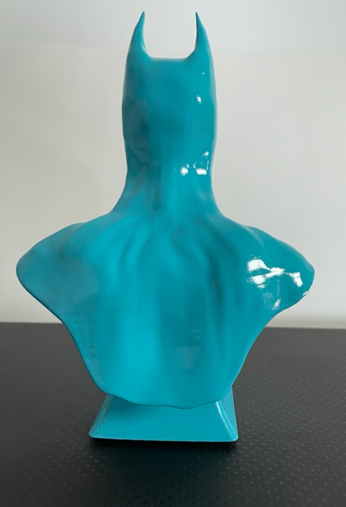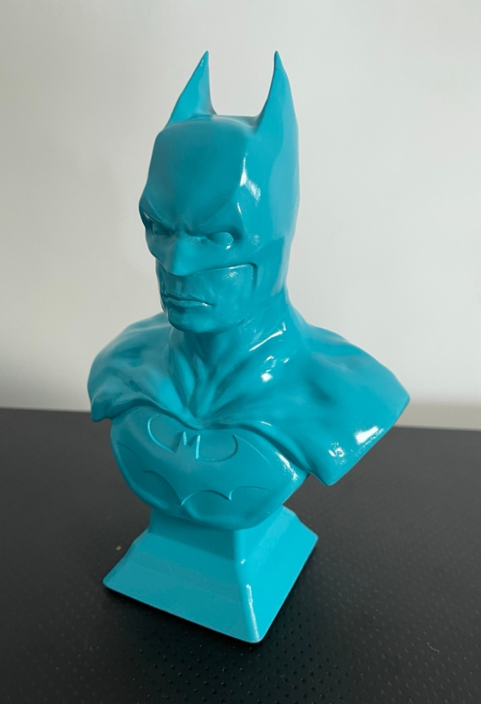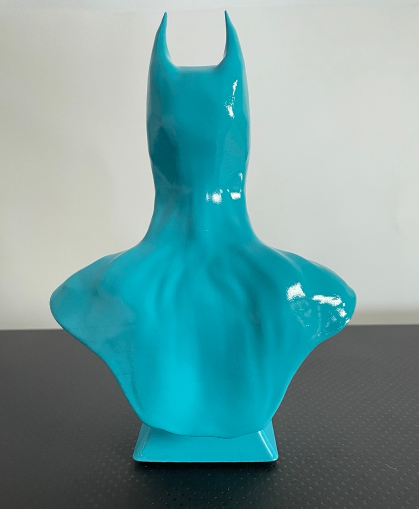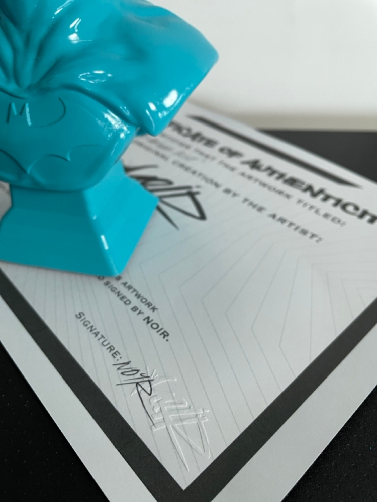 COLLECTOR'S ITEM!" "The Batman Bust (Cousteau blue edition)" Introducing an exceptional interpretation of this Noir's piece, this artwork is a resin sculpture titled "The Batman Bust (Cousteau blue edition)" This piece was carved from scratch by the artist and printed in resin, and then undergoes manual intervention by the artist. Due to the significant hand-crafted element, surface irregularities are normal and add to the piece's human touch without detracting from its value. The paint on this sculpture should be protected from friction and UV rays; it is intended for indoor display only. Please handle the sculpture with gloves. The work is shipped directly from the artist's studio. Certificate of Authenticity (COA) included. Noir, a passionate artist, discovered her deep-seated love for Urban art and Illustration from a tender age. Over the years, Noir's artistic journey has unfurled, expanding the skills into various creative realms, including concept art and digital painting, music, 3d sculpt and traditional painting. With an unbridled fervor for the diverse world of art, and armed with a background in visual arts, Noir's work reflects an unwavering commitment to the art form.