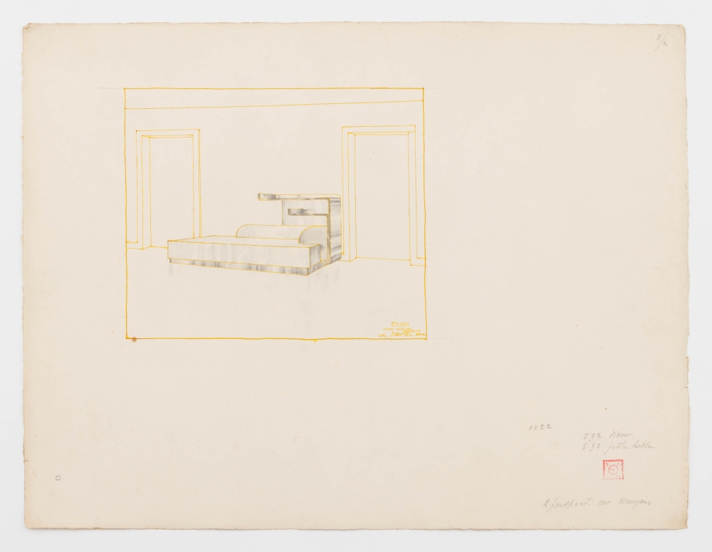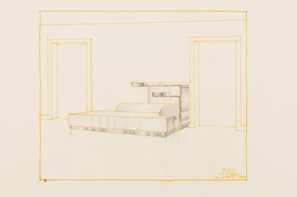 Origineel ontwerp voor meubilair, gesigneerd Maur. Carlier ensemblier Maurice Carlier (Sint-Joost-ten-Node, 1894 - Brussel, 1976) was een Belgisch architect, tekenaar, etser, schilder en beeldhouwer. Hij werkte mee aan de ontwikkeling van de abstracte beeldhouwkunst in België na de Tweede Wereldoorlog.